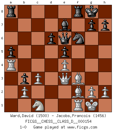 Last move : 1-0 2010 August 24 15:37:18 [Event "FICGS__CHESS__CLASS_D__000154"] [Site "FICGS"] [Date "2010.07.27"] [Round "1"] [White "Ward,David"] [Black "Jacobs,Francois"] [Result "1-0"] [WhiteElo "1500"] [BlackElo "1456"] 1.e4 c5 2.Nf3 e6 3.d4 cxd4 4.Nxd4 Nf6 5.Nc3 Nc6 6.Be2 d6 7.Be3 Be7 8.O-O O-O 9.f4 Qc7 10.f5 a6 11.Qe1 b5 12.Bf3 Bd7 13.a4 b4 14.fxe6 fxe6 15.Na2 Nxd4 16.Bxd4 a5 17.c3 e5 18.Be3 b3 19.Nc1 Qc4 20.Bf2 Bxa4 21.Qe3 Qe6 22.Rxa4 1-0 Sicilian : Anderssen variation Kingside Castling by player White (move 8) Kingside Castling by player Black (move 8) Player White won this chess game. Follow this game move after move (download)Many Chess players were surprised when after the game, Fischer quietly explained: 'I had already analyzed this possibility' in a position which I thought was not possible to foresee from the opening. (Mikhail Tal) Die größte Kunst beim Schach besteht darin dem Gegner nicht zu zeigen was er tun kann. (Garry Kasparov) Si tu oponente no puede hacer nada activo, entonces no apures la posición; En vez de eso, dejalo estar sentado ahí, sufriendo y rogandote por un empate. (Jeremy Silman) La tactique est l'élément le plus important du milieu de jeu. (Siegbert Tarrasch) Excelling at chess has long been considered a symbol of more general intelligence. That is an incorrect assumption in my view, as pleasant as it might be. But for the purposes of argument and investigation, chess is, in Russkin-Gutman's words, 'an unparalleled laboratory, since both the learning process and the degree of ability obtained can be objectified and quantified, providing an excellent comparative framework on which to use rigorous analytical techniques.' (The Chess Master and the Computer, by Garry Kasparov - 2010)