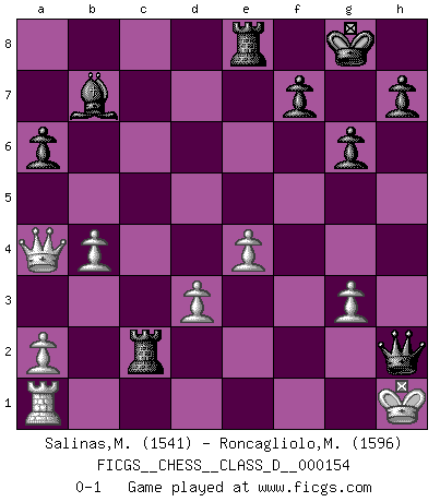 Last move : 0-1 2010 October 30 0:43:57 [Event "FICGS__CHESS__CLASS_D__000154"] [Site "FICGS"] [Date "2010.07.27"] [Round "1"] [White "Salinas,Marcelo"] [Black "Roncagliolo,Marco"] [Result "0-1"] [WhiteElo "1541"] [BlackElo "1596"] 1.e3 g6 2.Qg4 Bg7 3.Bc4 d5 4.Bb5+ c6 5.Qb4 cxb5 6.Qxb5+ Nc6 7.Nf3 Nf6 8.Nd4 Qc7 9.Nxc6 bxc6 10.Qc5 O-O 11.d3 e5 12.Nc3 Nd7 13.Qb4 Rb8 14.Qe7 Bb7 15.Qa3 a6 16.b4 d4 17.Ne4 Nf6 18.exd4 Nxe4 19.dxe4 exd4 20.Qd3 Rfe8 21.O-O c5 22.Re1 c4 23.Bf4 Qxf4 24.Qxc4 d3 25.cxd3 Bxa1 26.Rxa1 Rbc8 27.g3 Qd2 28.Qb3 Rc2 29.Qa4 Qxf2+ 30.Kh1 Qxh2+ 0-1 Van't Kruijs Opening Kingside Castling by player Black (move 10) Kingside Castling by player White (move 21) Player Black won this chess game. Follow this game move after move (download)Kasparov : J'adoube , Ivanchuk : S'il vous plaît ! (Garry Kasparov & Vassily Ivanchuk, Linares 1997) Wie ich sie so einen nach dem anderen nieder mähte wurde meine Überlegenheit offensichtlich. (José Raúl Capablanca) Nos gusta pensar. (Gary Kasparov) Les échecs c'est le défi de l'alpiniste, toujours plus haut, prêt à tout pour monter à l'assaut du Roi ennemi. Les échecs, c'est de la musique en mouvement, un ballet majestueux pour les yeux. C'est de la poésie composée par les fantômes du passé qui au même titre que Rimbaud ou Verlaine méritent notre admiration. Les échecs, c'est de la peinture ou le moindre mouvement modifie le tableau pour en faire un Picasso ou un Van Gogh. Les échecs, c'est tout et rien, c'est la vie et la mort. Jjulie33 sur le forum de France-Echecs. Optimism is a variety of information deficit. Sometimes especially true for correspondence chess games. (Michael Aigner)