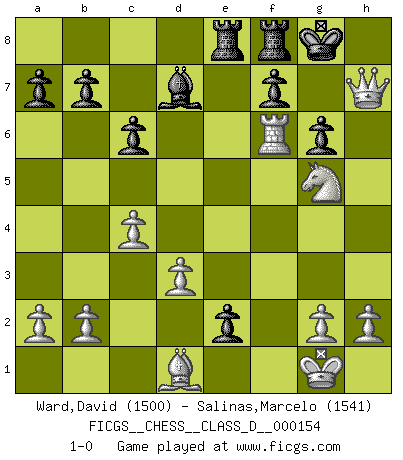 Last move : 1-0 2010 October 18 1:4:44 [Event "FICGS__CHESS__CLASS_D__000154"] [Site "FICGS"] [Date "2010.07.27"] [Round "1"] [White "Ward,David"] [Black "Salinas,Marcelo"] [Result "1-0"] [WhiteElo "1500"] [BlackElo "1541"] 1.e4 e5 2.Nf3 Nc6 3.Bb5 Qf6 4.Nc3 Nd4 5.Nxd4 exd4 6.Ne2 Bc5 7.d3 Nh6 8.O-O Ng4 9.Bf4 Bd6 10.Bxd6 Qxd6 11.f4 Ne3 12.Qd2 Qb6 13.c4 Nxf1 14.Rxf1 O-O 15.f5 d5 16.f6 g6 17.Qh6 Qxf6 18.Rxf6 c6 19.Ba4 dxe4 20.Nxd4 e3 21.Bd1 Bd7 22.Nf3 Rae8 23.Ng5 e2 24.Qxh7+ 1-0 Ruy Lopez (Spanish Opening) Kingside Castling by player White (move 8) Kingside Castling by player Black (move 14) Player White won this chess game. Follow this game move after move (download)Fischer is an American Chess tragedy on par with Morphy and Pillsbury. (Mig Greengard) Dein Körper muss in Topform sein. Dein Schach verfällt, wenn dein Körper verfällt. Der Körper kann nicht vom Geist getrennt werden. (Robert James Fischer) Botvinnik trató de alejar el misterio referente al Ajedrez, siempre relacionandolo a situaciones de la vida diaria. Solía llamar al Ajedrez un problema inexacto típico, similar a aquellos en que la gente tiene siempre que resolver a cada día. (Garry Kasparov) Les Echecs sont et restent toujours un combat, un combat intégral comme la boxe, la lutte ou un autre sport, et où il doit y avoir un vainqueur et un vaincu. (Joseph Emil Diemer) Question: Is 'This statement is paradoxical' a paradoxical statement ? Or is it a meta-paradox ? (Normajean Yates)