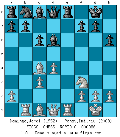 Last move : 1-0 2010 September 18 21:1:42 [Event "FICGS__CHESS__RAPID_A__000086"] [Site "FICGS"] [Date "2010.07.28"] [Round "1"] [White "Domingo,Jordi"] [Black "Panov,Dmitriy"] [Result "1-0"] [WhiteElo "1952"] [BlackElo "2008"] 1.e4 e5 2.Nf3 Nf6 3.Nxe5 d6 4.Nf3 Nxe4 5.d4 d5 6.Bd3 Bd6 7.O-O O-O 8.c4 c6 9.Re1 Re8 10.Nc3 Nxc3 11.bxc3 dxc4 12.Bxc4 h6 13.Rb1 1-0 This chess game has been lost on time (started : 2010.07.28 9:5:32) Petrov : Classical attack, Marshall variation Kingside Castling by player White (move 7) Kingside Castling by player Black (move 7) Player White won this chess game. Follow this game move after move (download)You sit at the board and suddenly your heart leaps. Your hand trembles to pick up the piece and move it. But what Chess teaches you is that you must sit there calmly and think about whether it's really a good idea and whether there are other better ideas. (Stanley Kubrick) Die Fehler sind da, Sie warten nur darauf gemacht zu werden. (Savielly Grigorievitsch Tartakower) El Ajedrez es parte de la cultura, y si una cultura esta en decadencia, entonces también el Ajedrez declinará. (Mikhail Botvinnik) Plusieurs personnes se sont demandées comment Tal faisait pour gagner... En fait, c'est très simple ! Il met ses pièces au centre de l'échiquier et les sacrifie quelque part ! (David Bronstein) Memory is a way of holding onto the things you love, the things you are, the things you never want to lose. (from the television show: The Wonder Years)