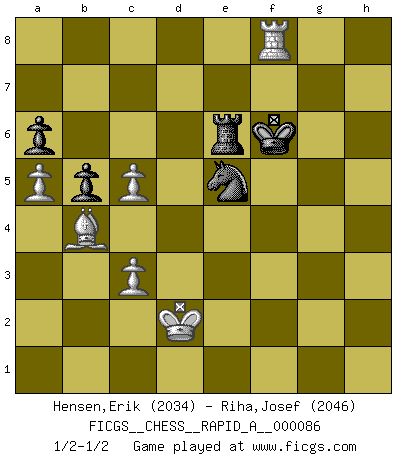 Last move : 1/2-1/2 2010 August 8 17:33:2 [Event "FICGS__CHESS__RAPID_A__000086"] [Site "FICGS"] [Date "2010.07.28"] [Round "1"] [White "Hensen,Erik"] [Black "Riha,Josef"] [Result "1/2-1/2"] [WhiteElo "2034"] [BlackElo "2046"] 1.e4 e6 2.d4 d5 3.Nc3 Bb4 4.exd5 exd5 5.Bd3 Nc6 6.a3 Bxc3+ 7.bxc3 Nge7 8.Rb1 b6 9.Qh5 Be6 10.Nf3 Qd7 11.Ng5 g6 12.Qf3 O-O 13.Qf6 Bf5 14.O-O Bxd3 15.cxd3 Qf5 16.Qxf5 Nxf5 17.Nh3 Nd8 18.Re1 Ng7 19.Bh6 Nde6 20.a4 Rfe8 21.g4 f6 22.f3 c6 23.Kf2 Nc7 24.Be3 Re7 25.a5 b5 26.Nf4 g5 27.Ng2 Nce6 28.h4 Rae8 29.Bc1 h6 30.Kg3 f5 31.Ba3 Rf7 32.Re5 a6 33.Rh1 Rf6 34.R5e1 Rg6 35.hxg5 hxg5 36.Re5 Rf6 37.Ne1 fxg4 38.fxg4 Nf4 39.Nf3 Nxd3 40.Rxe8+ Nxe8 41.Rd1 Nf4 42.Rd2 Rg6 43.Nxg5 Ne6 44.Nxe6 Rxe6 45.Rh2 Nf6 46.Kf4 Ne4 47.Bb4 Rf6+ 48.Ke5 Rg6 49.Rh1 Kg7 50.Rf1 Kh6 51.Rf4 Kg7 52.Rf5 Ng5 53.Rf8 Nf7+ 54.Kf4 Rf6 55.Ke3 Nh6 56.Ra8 Nxg4+ 57.Kd3 c5 58.dxc5 Ne5+ 59.Kd4 Nc6 60.Kxd5 Kf7 61.Rh8 Ne7+ 62.Ke4 Re6 63.Kd3 Nc6 64.Ra8 Kf6 65.Kd2 Ne5 66.Rf8+ 1/2-1/2 French : Winawer (Nimzovich) variation Kingside Castling by player Black (move 12) Kingside Castling by player White (move 14) This chess game ended in a draw. Follow this game move after move (download)Good offense and good defense both begin with good development. (Bruce A. Moon) Die Neutralität betrachte ich als eine schwere Krankheit. (Viktor Kortschnoi) Botvinnik trató de alejar el misterio referente al Ajedrez, siempre relacionandolo a situaciones de la vida diaria. Solía llamar al Ajedrez un problema inexacto típico, similar a aquellos en que la gente tiene siempre que resolver a cada día. (Garry Kasparov) On est toujours la mazette de quelqu'un d'autre. (Anonyme) For a mechanic, you seem to do an excessive amount of thinking. (C-3PO in Star Wars ep.2)