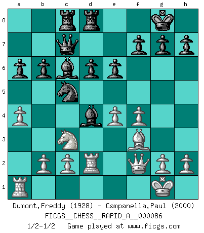 Last move : 1/2-1/2 2010 August 9 11:7:31 [Event "FICGS__CHESS__RAPID_A__000086"] [Site "FICGS"] [Date "2010.07.28"] [Round "1"] [White "Dumont,Freddy"] [Black "Campanella,Paul"] [Result "1/2-1/2"] [WhiteElo "1928"] [BlackElo "2000"] 1.e4 c5 2.Nf3 d6 3.d4 cxd4 4.Nxd4 Nf6 5.Nc3 a6 6.Be2 e6 7.O-O Be7 8.f4 Qc7 9.a4 Nc6 10.Nb3 b6 11.Bf3 O-O 12.Be3 Bb7 13.Qe2 Rac8 14.Rfd1 Rfd8 15.Rd2 Nd7 16.Qf2 Nc5 17.Nd4 Bf6 18.Nxc6 Bxc6 19.Bd4 Bxd4 1/2-1/2 Sicilian : Najdorf, Opovcensky variation Kingside Castling by player White (move 7) Kingside Castling by player Black (move 11) This chess game ended in a draw. Follow this game move after move (download)Strategy requires thought, tactics require observation. (Max Euwe) Im Spitzenschach von heute geht es nur um Vorbereitung, um tiefgründige, sorgfältige Eröffnungsvorbereitung. (Nigel Short) Los Peones son nacidos libres, y aún así, se encuentran por doquier encadenados. (Rick Kennedy) Dieu déplace le joueur, et celui-ci la pièce. Quel Dieu derrière Dieu commence donc la trame ? Arturo Perez-Reverte (prix de littérature policière 1993). Perhaps the current trend of many chess professionals taking up the more lucrative pastime of poker is not a wholly negative one. It may not be too late for humans to relearn how to take risks in order to innovate and thereby maintain the advanced lifestyles we enjoy. And if it takes a poker-playing supercomputer to remind us that we can't enjoy the rewards without taking the risks, so be it. (The Chess Master and the Computer, by Garry Kasparov - 2010)