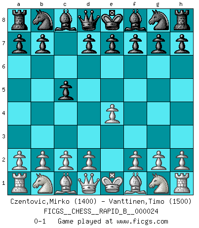 Last move : 0-1 2006 December 18 0:49:43 [Event "FICGS__CHESS__RAPID_B__000024"] [Site "FICGS"] [Date "2006.11.16"] [Round "1"] [White "Czentovic,Mirko"] [Black "Vanttinen,Timo"] [Result "0-1"] [WhiteElo "1400"] [BlackElo "1500"] 1.e4 c5 0-1 This chess game has been lost on time (started : 2006.11.16 0:7:54) Sicilian defense Player Black won this chess game. Follow this game move after move (download)It is not a move, even the best move that you must seek, but a realizable plan. (Eugene Znosko-Borovsky) Ich bin stolz ein Bulgare zu sein. (Veselin Topalov) Uno no tiene que jugar muy bien, es suficiente jugar mejor que el oponente. (Siegbert Tarrasch) Aidez vos pièces, elles vous aideront. (Paul Morphy) It is a good thing for an uneducated man to read books of quotations. (Winston Churchill)