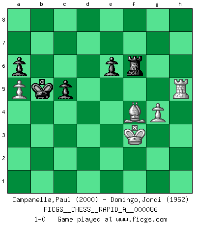 Last move : 1-0 2010 November 5 16:41:19 [Event "FICGS__CHESS__RAPID_A__000086"] [Site "FICGS"] [Date "2010.07.28"] [Round "1"] [White "Campanella,Paul"] [Black "Domingo,Jordi"] [Result "1-0"] [WhiteElo "2000"] [BlackElo "1952"] 1.d4 h6 2.e4 c5 3.d5 d6 4.Nf3 g5 5.Be2 Nf6 6.Nc3 Nbd7 7.a4 Qa5 8.O-O a6 9.Bd2 Bg7 10.h3 g4 11.hxg4 Nxg4 12.Nh4 Ndf6 13.f3 Ne5 14.Qe1 Rg8 15.f4 Neg4 16.e5 dxe5 17.fxe5 Nxe5 18.Bb5+ axb5 19.Nxb5 Qd8 20.Qxe5 Nxd5 21.Qxd5 Qxd5 22.Nc7+ Kd8 23.Nxd5 Bxb2 24.Rae1 Be6 25.Nb6 Ra6 26.Nf5 Rg4 27.a5 Ke8 28.Rf2 h5 29.c4 Bf6 30.Nd5 Bxd5 31.cxd5 e6 32.dxe6 fxe6 33.Ne3 Rg6 34.Nd5 Bd4 35.Nc7+ Kd7 36.Nxa6 Bxf2+ 37.Kxf2 bxa6 38.Re5 Rf6+ 39.Ke3 Rg6 40.Kf3 Rf6+ 41.Bf4 Kc6 42.Rxh5 Kb5 43.g4 1-0 Queen's pawn Kingside Castling by player White (move 8) 10 pieces endgame at move 42 : White KRBPP , Black KRPPP WHITE : King + 1 Rook 1 Bishop 2 Pawns BLACK : King + 1 Rook 3 Pawns Player White won this chess game. Follow this game move after move (download)Many have become Chess Masters, no one has become the Master of Chess. (Siegbert Tarrasch) Pläne sind die Träume des Verständigen. (Ernst Freiherr von Feuchtersleben) Yo tuve un dolor de muelas en la primer partida. En el segundo juego, tuve un dolor de cabeza. En el tercero, tuve un ataque de reumatísmo. En la cuarta partida, no me sentía muy bien. ¿Y en el quinto juego? Bueno, ¿que acaso uno tiene que ganar todos los juegos?. (Siegbert Tarrasch) D'abord les bases : Jouez et étudiez, puis étudiez et jouez, ensuite jouez et étudiez, puis étudiez et jouez. Deuxièmement : Donnez toujours le meilleur de vous-même ! (Ken Smith) The bottom line is always the bottom line. (Johann Piek)