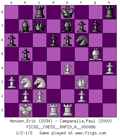 Last move : 1/2-1/2 2010 August 1 20:52:59 [Event "FICGS__CHESS__RAPID_A__000086"] [Site "FICGS"] [Date "2010.07.28"] [Round "1"] [White "Hensen,Erik"] [Black "Campanella,Paul"] [Result "1/2-1/2"] [WhiteElo "2034"] [BlackElo "2000"] 1.e4 c5 2.Nf3 d6 3.d4 cxd4 4.Nxd4 Nf6 5.Nc3 a6 6.Bc4 e6 7.Bb3 Be7 8.g4 h6 9.Rg1 Nbd7 10.Be3 Nc5 11.Qf3 Qc7 12.h4 h5 13.gxh5 Nxh5 14.O-O-O b5 15.Kb1 Rb8 16.Bg5 Bb7 17.a3 Nf6 18.Rge1 Nxb3 19.Nxb3 Rc8 1/2-1/2 Sicilian : Najdorf, Lipnitzky attack Queenside Castling by player White (move 14) This chess game ended in a draw. Follow this game move after move (download)First-class players lose to second class players because second-class players sometimes play a first-class game. (Tarrasch) Garry Kasparov war erst in der Großmeister-Organisation GMA, dann in der Profischach-Vereinigung PCA, zum Schluss kehrte er wieder in den Schoß der FIDE zurück. Aber gut, manche Leute sind flexibel (Viswanathan Anand) El Rey es una pieza de pelea. ¡Usenlo!. (Wilhelm Steinitz) C'est la seule position que je connaisse où les deux camps sont mals. Propos prêtés à V. Anand. The best teachers teach from the heart, not from the book. (Author unknown)