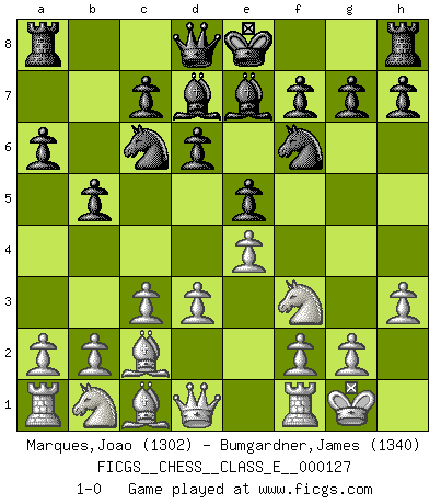Last move : 1-0 2010 September 21 8:59:30 [Event "FICGS__CHESS__CLASS_E__000127"] [Site "FICGS"] [Date "2010.07.30"] [Round "1"] [White "Marques,Joao"] [Black "Bumgardner,James"] [Result "1-0"] [WhiteElo "1302"] [BlackElo "1340"] 1.e4 e5 2.Nf3 Nc6 3.Bb5 d6 4.c3 Bd7 5.O-O a6 6.Ba4 b5 7.Bc2 Nf6 8.d3 Be7 9.h3 1-0 This chess game has been lost on time (started : 2010.07.30 14:7:18) Ruy Lopez : Old Steinitz defense Kingside Castling by player White (move 5) Player White won this chess game. Follow this game move after move (download)Chess is above all, a fight ! (Emanuel Lasker) Man gibt nur Pakete auf. (Paul Keres) Aquellos que dicen que entienden al Ajedrez, no entienden nada. (Robert Hubner) Ce qui caractérise les parties de combat, c'est que si le défenseur a constamment de difficiles problèmes à résoudre, l'attaquant doit chercher sans relâche de nouvelles possibilités d'attaque. (Koblentz) The large trees attract high winds. (Chinese proverb)