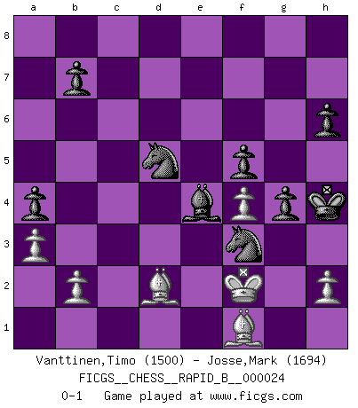 Last move : 0-1 2007 February 1 2:6:0 [Event "FICGS__CHESS__RAPID_B__000024"] [Site "FICGS"] [Date "2006.11.16"] [Round "1"] [White "Vanttinen,Timo"] [Black "Josse,Mark"] [Result "0-1"] [WhiteElo "1500"] [BlackElo "1694"] 1.c4 e5 2.Nc3 Nc6 3.g3 g6 4.Bg2 Bg7 5.d3 d6 6.Nf3 h6 7.O-O Nge7 8.a3 a5 9.Bd2 Be6 10.Nb5 f5 11.Qc2 O-O 12.e3 g5 13.d4 Bf7 14.dxe5 dxe5 15.Rad1 Qc8 16.Bc3 Bxc4 17.Nxc7 Qxc7 18.Rfe1 g4 19.Nh4 a4 20.Rd2 Bb3 21.Qb1 Rad8 22.Rxd8 Qxd8 23.Re2 Qd1+ 24.Qxd1 Bxd1 25.Rd2 Rd8 26.Rxd8+ Nxd8 27.Bb4 Ndc6 28.Bc3 Bc2 29.Bf1 Bf6 30.Bb5 Bxh4 31.gxh4 Kf7 32.Kf1 Kg6 33.Ke2 Kh5 34.f4 exf4 35.exf4 Kxh4 36.Kf2 Nd5 37.Bd2 Kh3 38.Kg1 Nd4 39.Bf1+ Kh4 40.Kg2 Be4+ 41.Kf2 Nf3 0-1 English : Closed system Kingside Castling by player White (move 7) Kingside Castling by player Black (move 11) Player Black won this chess game. Follow this game move after move (download)Strategy requires thought, tactics require observation. (Max Euwe) Irgendwie scheint mir sonntags früh um 9 Uhr der Killerinstinkt verloren gegangen zu sein. (Alexej Shirov) Cuando tengo las piezas blancas, yo gano porque soy blanco; Cuando tengo las piezas negras, yo gano porque soy Bogolyubov. (Bogolyubov) Tout change constamment, y compris dans le monde des Echecs. (Botvinnik) The weakness of an artist is dogma. (Josh Waitzkin)
