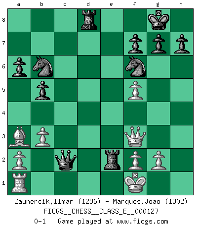 Last move : 0-1 2011 January 14 23:3:17 [Event "FICGS__CHESS__CLASS_E__000127"] [Site "FICGS"] [Date "2010.07.30"] [Round "1"] [White "Zaunercik,Ilmar"] [Black "Marques,Joao"] [Result "0-1"] [WhiteElo "1296"] [BlackElo "1302"] 1.e4 e5 2.Nf3 Nc6 3.Bb5 a6 4.Ba4 b5 5.Bb3 Nf6 6.O-O Be7 7.Re1 O-O 8.c3 Bb7 9.d3 d6 10.Nbd2 Re8 11.Nf1 Na5 12.Bc2 c5 13.Ng3 Qc7 14.Nf5 Bc8 15.d4 Bxf5 16.exf5 cxd4 17.cxd4 Nc4 18.b3 Nb6 19.dxe5 dxe5 20.Nxe5 Rad8 21.Qf3 Bd6 22.Nd3 Bxh2+ 23.Kf1 Qxc2 24.Ne5 Bxe5 25.Ba3 Bxa1 26.Rxa1 Re2 0-1 This chess game has been lost on time (started : 2010.07.30 14:7:18) Ruy Lopez : Caro variation Kingside Castling by player White (move 6) Kingside Castling by player Black (move 7) Player Black won this chess game. Follow this game move after move (download)War is the child of passion, passion is the child of narcissism and narcissism is the child. (...) Another game ? (Thibault de Vassal) Obwohl ich alt bin, darf mir niemand den Finger in den Mund stecken, sonst beisse ich. (Wilhelm Steinitz) El estómago es una parte esencial del maestro de Ajedrez. (Bent Larsen) Les échecs sont utiles à l'exercice de la faculté de penser et à celle de l'imagination. Car nous devons posséder une méthode élaborée pour atteindre des buts partout où nous devons conduire notre raison. (Leibnitz) History is a gallery of pictures in which there are few originals and many copies. (Alexis de Tocqueville)