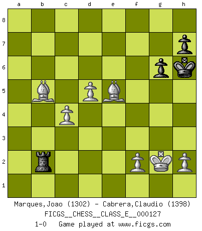Last move : 1-0 2010 October 19 13:51:54 [Event "FICGS__CHESS__CLASS_E__000127"] [Site "FICGS"] [Date "2010.07.30"] [Round "1"] [White "Marques,Joao"] [Black "Cabrera,Claudio"] [Result "1-0"] [WhiteElo "1302"] [BlackElo "1398"] 1.e4 e5 2.Nf3 Nc6 3.Bb5 a6 4.Ba4 Nf6 5.O-O Be7 6.Re1 b5 7.Bb3 O-O 8.c3 d5 9.exd5 Nxd5 10.Nxe5 Nxe5 11.Rxe5 Bd6 12.Rxd5 Bb7 13.Rh5 g6 14.Rh3 Bc8 15.Re3 Qh4 16.g3 Qh3 17.Qf1 Qh5 18.Bd1 Qd5 19.Qg2 Bb7 20.Qxd5 Bxd5 21.d4 Rae8 22.Rxe8 Rxe8 23.Be3 f5 24.Nd2 f4 25.gxf4 Bxf4 26.Bxf4 Re1+ 27.Nf1 Bc4 28.Bxc7 Rxf1+ 29.Kg2 Kg7 30.a4 Be2 31.Be5+ Kh6 32.Bxe2 Rxa1 33.axb5 axb5 34.Bxb5 Ra2 35.d5 Rxb2 36.c4 1-0 Ruy Lopez : Closed, 7...O-O Kingside Castling by player White (move 5) Kingside Castling by player Black (move 7) Player White won this chess game. Follow this game move after move (download)I'm not afraid of Spassky. The world knows I'm the best. You don't need a match to prove it. (Bobby Fischer) Am wohlsten fühle ich mich, wenn ich sehe, wie sich mein Gegner im Todeskampf windet. (Robert James Fischer) El muchacho (en ese entonces un niño de 12 años llamado Anatoly Karpov) no tiene ni idea de lo que es el Ajedrez y no hay futuro en absoluto para el en esta profesión. (Mikhail Botvinnik) On est toujours la mazette de quelqu'un d'autre. (Anonyme) Patience, use the Force, think ! (Obi-Wan Kenobi in Star Wars ep.2)