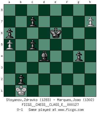 Last move : 0-1 2010 November 18 5:58:53 [Event "FICGS__CHESS__CLASS_E__000127"] [Site "FICGS"] [Date "2010.07.30"] [Round "1"] [White "Stoyanov,Zdravko"] [Black "Marques,Joao"] [Result "0-1"] [WhiteElo "1283"] [BlackElo "1302"] 1.e4 e5 2.Nf3 Nc6 3.Bb5 a6 4.Bxc6 dxc6 5.h3 Bd6 6.a3 Nf6 7.d3 O-O 8.O-O b5 9.Bg5 Qe7 10.c3 Qe6 11.Bxf6 Qxf6 12.Nbd2 Qg6 13.Nh4 Qg5 14.Ndf3 Qf4 15.b4 Be7 16.Qc1 Qf6 17.c4 g5 18.Nxg5 Qxg5 19.Qxg5+ Bxg5 20.Nf3 Bf6 21.c5 Be6 22.Rfd1 Rad8 23.a4 Rd7 24.a5 Rfd8 25.Ne1 Bc4 26.Ra3 Bg7 27.Kf1 f5 28.Ke2 fxe4 29.f3 exd3+ 30.Nxd3 Re8 31.Ke3 Red8 32.Ke4 Bxd3+ 33.Raxd3 Rxd3 34.Rxd3 Rxd3 35.Kxd3 Kf7 36.Ke4 Ke6 37.h4 Bh6 38.g4 Bd2 39.g5 Bxb4 40.h5 Bxc5 41.f4 exf4 42.Kxf4 b4 43.g6 hxg6 44.h6 Bd4 45.Ke4 c5 46.h7 b3 47.Kd3 b2 48.Kc2 g5 49.Kb1 g4 0-1 Ruy Lopez : Exchange variation Kingside Castling by player Black (move 7) Kingside Castling by player White (move 8) 10 pieces endgame at move 43 : White KPP , Black KBPPPPP WHITE : King + 2 Pawns BLACK : King + 1 Bishop 5 Pawns Player Black won this chess game. Follow this game move after move (download)Alekhine is a poet who creates a work of art out of something that would hardly inspire another man to send home a picture post card. (Max Euwe) Die starken Figuren des Gegners muss man abtauschen. (José Raúl Capablanca) El Ajedrez lo es todo: arte, ciencia y deporte. (Anatoly Karpov) Dieu déplace le joueur, et celui-ci la pièce. Quel Dieu derrière Dieu commence donc la trame ? Arturo Perez-Reverte (prix de littérature policière 1993). All battles are fought by scared men who'd rather be someplace else. (John Wayne in the movie In harm's way)