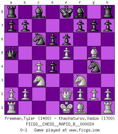 Last move : 0-1 2006 December 27 8:24:0 [Event "FICGS__CHESS__RAPID_B__000024"] [Site "FICGS"] [Date "2006.11.16"] [Round "1"] [White "Freeman,Tyler"] [Black "Khachaturov,Vadim"] [Result "0-1"] [WhiteElo "1400"] [BlackElo "1700"] 1.e4 c5 2.c4 Nc6 3.Nf3 e6 4.Nc3 Nf6 5.e5 Ng4 6.Qe2 d6 7.d4 cxd4 8.Bg5 Qa5 0-1 This chess game has been lost on time (started : 2006.11.16 0:7:54) Sicilian defense Player Black won this chess game. Follow this game move after move (download)A thorough understanding of the typical mating continuations makes the most complicated sacrificial combinations leading up to them not only not difficult, but almost a matter of course. (Siegbert Tarrasch) Bogoljubow: Matt in vier Zügen! Tartakower: Ich verbitte mir jede Belästigung! (Savielly Grigorievitsch Tartakower) Muchos se han convertido en Maestros de Ajedrez, nadie se ha convertido en el Maestro del Ajedrez. (Siegbert Tarrasch) La conception d'un plan est le processus par lequel un joueur exploite les avantages de sa position tout en s'efforçant d'en réduire au minimum les inconvénients. Afin de garantir le succès, un plan doit toujours se fonder sur un diagnostic objectif des particularités d'une position. La conception d'un plan est d'autant plus difficile que la position est équilibrée, et grandement facilitée lorsqu'il n'existe qu'un seul plan susceptible de répondre aux exigences de la position. (Harry Golombek) Hardware: the parts of a computer that can be kicked. (Jeff Persis)