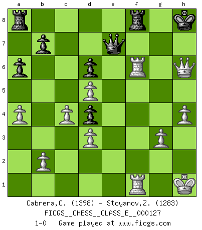 Last move : 1-0 2010 September 5 19:58:45 [Event "FICGS__CHESS__CLASS_E__000127"] [Site "FICGS"] [Date "2010.07.30"] [Round "1"] [White "Cabrera,Claudio"] [Black "Stoyanov,Zdravko"] [Result "1-0"] [WhiteElo "1398"] [BlackElo "1283"] 1.e4 c5 2.Nc3 a6 3.a4 Nc6 4.g3 e5 5.Bg2 Be7 6.Nge2 Nf6 7.O-O O-O 8.d3 h6 9.h3 d6 10.Nd5 Nxd5 11.exd5 Na7 12.c4 Qa5 13.Bd2 Qb6 14.Bc3 Bf5 15.f4 exf4 16.Nxf4 Bg5 17.Nh5 Bg6 18.Nxg7 Qd8 19.h4 Be3+ 20.Kh1 Bd4 21.Bxd4 cxd4 22.Nf5 Bxf5 23.Rxf5 Nc8 24.Qh5 Ne7 25.Rf6 Ng6 26.Raf1 Kg7 27.Be4 Qe7 28.Bxg6 fxg6 29.Qxg6+ Kh8 30.Qxh6+ 1-0 Sicilian : Closed Kingside Castling by player White (move 7) Kingside Castling by player Black (move 7) Player White won this chess game. Follow this game move after move (download)I'm not afraid of Spassky. The world knows I'm the best. You don't need a match to prove it. (Bobby Fischer) Der Verteidiger gebe der Gewalt nach, aber nur der Gewalt. Er schaffe sich nicht freiwillig, etwa aus Blindheit oder aus Schrecken, irgendwelche Schwächen. Er lasse sich nicht bluffen. (Emanuel Lasker) Solo los afeminados hacen el Enroque. (Rob Sillars) Les échecs sont un jeu par leur forme, un art par leur essence et une science par sa difficulté d'acquisition. Ils peuvent vous procurer autant de plaisir qu'un bon livre ou une belle musique, mais vous n'aurez une réelle joie que si vous arrivez à bien jouer. (Tigran Petrosian) A woman without a man is like a fish without a bicycle. (Gloria Steinem)