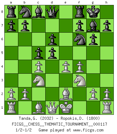 Last move : 1/2-1/2 2010 August 25 14:22:33 [Event "FICGS__CHESS__THEMATIC_TOURNAMENT__000117"] [Site "FICGS"] [Date "2010.07.31"] [Round "1"] [White "Tanda,Giovanni"] [Black "Ropokis,Dimitrios"] [Result "1/2-1/2"] [WhiteElo "2032"] [BlackElo "1800"] 1.d4 Nf6 2.c4 g6 3.Nc3 Bg7 4.e4 d6 5.f4 O-O 6.Nf3 c5 7.d5 e6 8.Be2 exd5 1/2-1/2 King's Indian : Four pawns attack, dynamic line Kingside Castling by player Black (move 5) This chess game ended in a draw. Follow this game move after move (download)Without error there can be no brilliancy. (Emanuel Lasker) Zeige mir drei Eröffnungsvarianten und ich beweise dir, dass zwei davon inkorrekt sind. (Emanuel Lasker) Aunque la mayoría de la gente disfruta observar las partidas de los grandes Maestros de ataque, algunos de los jugadores mas notables en la historia han sido los jugadores silenciosos posicionales. Lentamente ellos te aplastan despojandote de tu espacio, congestionando tus piezas y dejandote virtualmente sin nada que hacer. (Yasser Seirawan) Si le désir cupide (et stupide) de gagner est une inépuisable source de souffrance, une combinaison brillante sur l'échiquier est une découverte : le coquelicot qui s'épanouit lorsque apparaît la Voie Lactée. (Arrabal) Luck is the residue of design. (John Milton)