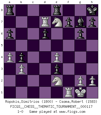 Last move : 1-0 2010 August 9 20:47:7 [Event "FICGS__CHESS__THEMATIC_TOURNAMENT__000117"] [Site "FICGS"] [Date "2010.07.31"] [Round "1"] [White "Ropokis,Dimitrios"] [Black "Csoma,Robert"] [Result "1-0"] [WhiteElo "1800"] [BlackElo "1583"] 1.d4 Nf6 2.c4 g6 3.Nc3 Bg7 4.e4 d6 5.f3 O-O 6.Be3 c6 7.Bd3 Qc7 8.Nge2 e5 9.O-O Nbd7 10.Qc2 a6 11.Rad1 b5 12.cxb5 cxb5 13.Rc1 Bb7 14.a4 b4 15.Nd5 Qxc2 16.Ne7+ Kh8 17.Rxc2 Rfe8 18.Rc7 Bxe4 19.Bxe4 Nxe4 20.Rxd7 exd4 21.fxe4 dxe3 22.b3 1-0 King's Indian : Saemisch, 5...O-O Kingside Castling by player Black (move 5) Kingside Castling by player White (move 9) Player White won this chess game. Follow this game move after move (download)The essence of Chess is thinking about what Chess is. (David Bronstein) Jeder Schachmeister war einmal ein Anfänger. (Irving Chernev) Un buen jugador siempre tiene buena suerte. (José Raúl Capablanca) Aucun coup ne doit être joué sans but. (Pedro Damiano) A cynic is a man who knows the price of everything but the value of nothing. (Oscar Wilde)
