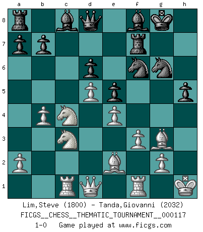 Last move : 1-0 2010 November 1 20:19:32 [Event "FICGS__CHESS__THEMATIC_TOURNAMENT__000117"] [Site "FICGS"] [Date "2010.07.31"] [Round "1"] [White "Lim,Steve"] [Black "Tanda,Giovanni"] [Result "1-0"] [WhiteElo "1800"] [BlackElo "2032"] 1.d4 Nf6 2.c4 g6 3.Nc3 Bg7 4.e4 d6 5.Nf3 O-O 6.Be2 e5 7.O-O Nc6 8.d5 Ne7 9.Ne1 Nd7 10.f3 f5 11.Be3 f4 12.Bf2 g5 13.b4 Nf6 14.c5 Ng6 15.Nd3 h5 16.Rc1 Rf7 17.Nb2 g4 18.Nc4 Bf8 19.cxd6 cxd6 20.Kh1 g3 21.hxg3 fxg3 22.Bxg3 1-0 King's Indian : Orthodox, Aronin-Taimanov variation (Yugoslav attack / Mar del Plata variation) Kingside Castling by player Black (move 5) Kingside Castling by player White (move 7) Player White won this chess game. Follow this game move after move (download)I don't believe in psychology. I believe in good moves. (Bobby Fischer) Im Spitzenschach von heute geht es nur um Vorbereitung, um tiefgründige, sorgfältige Eröffnungsvorbereitung. (Nigel Short) El Ajedrez tiene tanto misterio como las mujeres. (Purdy) Le profane ne songe pas à la somme de jouissance dont il se prive, qui méconnaît ce jeu aux ressources aussi variées que passionnantes. (Jean-Marie Jeanton-Lamarche) Two beer, or not two beer. (Unknown)