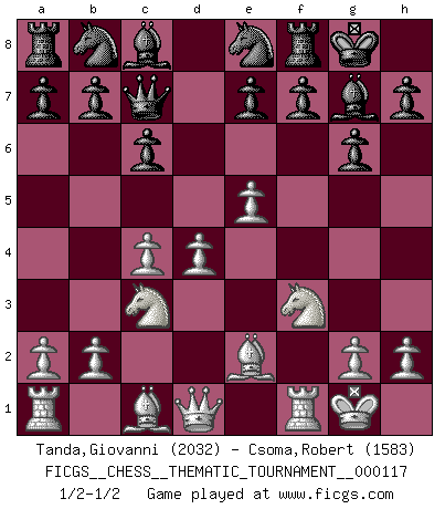 Last move : 1/2-1/2 2010 August 30 19:23:53 [Event "FICGS__CHESS__THEMATIC_TOURNAMENT__000117"] [Site "FICGS"] [Date "2010.07.31"] [Round "1"] [White "Tanda,Giovanni"] [Black "Csoma,Robert"] [Result "1/2-1/2"] [WhiteElo "2032"] [BlackElo "1583"] 1.d4 Nf6 2.c4 g6 3.Nc3 Bg7 4.e4 d6 5.f4 O-O 6.Nf3 c6 7.Be2 Qc7 8.e5 dxe5 9.fxe5 Ne8 10.O-O 1/2-1/2 King's Indian : Four pawns attack Kingside Castling by player Black (move 5) Kingside Castling by player White (move 10) This chess game ended in a draw. Follow this game move after move (download)Chess problems demand from the composer the same virtues that characterize all worthwhile art: originality, invention, conciseness, harmony, complexity, and splendid insincerity. (Vladimir Nabokov) Ich habe Putins Aufstieg an die Macht beobachtet und seine Politik, die demokratischen Institutionen meines Landes zu zerstören. (Garry Kasparov) Juega la Apertura como un libro, el Juego Medio como un mago y los Finales como una máquina. (Spielmann) Celui qui prend des risques peut perdre, celui qui n'en prend pas perd toujours. (Xavier Tartacover) You must have a dream in order to have it come true. (A.P.J. Kalam)