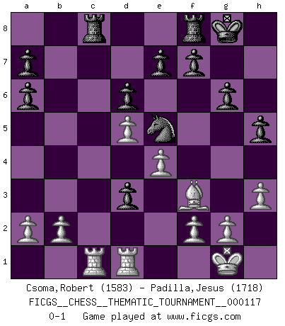 Last move : 0-1 2010 November 11 21:58:56 [Event "FICGS__CHESS__THEMATIC_TOURNAMENT__000117"] [Site "FICGS"] [Date "2010.07.31"] [Round "1"] [White "Csoma,Robert"] [Black "Padilla,Jesus"] [Result "0-1"] [WhiteElo "1583"] [BlackElo "1718"] 1.d4 Nf6 2.c4 g6 3.Nc3 Bg7 4.e4 d6 5.Nf3 O-O 6.Be2 c5 7.d5 Na6 8.O-O Bg4 9.Be3 Nd7 10.Qd2 Qa5 11.Bh6 Bxf3 12.Bxf3 Bxh6 13.Qxh6 Qb4 14.Qd2 Qxc4 15.Rac1 Qd4 16.Qxd4 cxd4 17.Nb5 d3 18.Rfd1 Ne5 19.Nc7 Rac8 20.Nxa6 bxa6 21.h3 h5 0-1 King's Indian : 6.Be2 Kingside Castling by player Black (move 5) Kingside Castling by player White (move 8) Player Black won this chess game. Follow this game move after move (download)No Chess Grandmaster is normal; they only differ in the extent of their madness. (Viktor Korchnoi) Vielleicht wirkt die Aura früherer Spieler glanzvoller als die der heutigen Spieler, aber das liegt daran, dass man kein Programm wie Fritz hatte, das einem all die Löcher in ihren Partien zeigt. (Vladimir Kramnik) Bobby es el jugador de Ajedrez mas fino que este país jamás haya producido. Su memoria para las movidas, su brillantez en soñar combinaciones y su feróz determinación por la victoria son algo extraño. (John Collins) 'L'échange des dames est un coup dur pour les deux adversaires...' Un journaliste lors d'une partie du match Spassky-Fischer Follow your passion, and success will follow you. (Arthur Buddhold)
