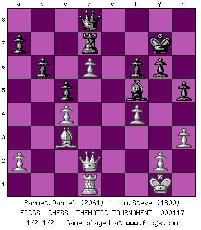 Last move : 1/2-1/2 2010 September 30 11:25:42 [Event "FICGS__CHESS__THEMATIC_TOURNAMENT__000117"] [Site "FICGS"] [Date "2010.07.31"] [Round "1"] [White "Parmet,Daniel"] [Black "Lim,Steve"] [Result "1/2-1/2"] [WhiteElo "2061"] [BlackElo "1800"] 1.d4 Nf6 2.c4 g6 3.Nc3 Bg7 4.e4 d6 5.Nf3 O-O 6.Be2 e5 7.O-O exd4 8.Nxd4 Nc6 9.Be3 Nxd4 10.Bxd4 b6 11.f4 Re8 12.Bf3 Rb8 13.Qd3 c5 14.Bf2 Ng4 15.Nb5 Bxb2 16.Bxg4 Bxg4 17.Rae1 Bg7 18.h3 Bc8 19.Nxd6 Bf8 20.e5 Bf5 21.Qd2 h5 22.Rd1 Bxd6 23.exd6 Rb7 24.Rfe1 Rd7 25.Qd5 Rxe1+ 26.Bxe1 Kg7 27.Bc3+ f6 28.Qd2 1/2-1/2 King's Indian : Orthodox variation Kingside Castling by player Black (move 5) Kingside Castling by player White (move 7) This chess game ended in a draw. Follow this game move after move (download)Life is a kind of Chess, with struggle, competition, good and ill events. (Benjamin Franklin) Strategie ist, wie man ein Mädchen auf den Rücksitz bekommt. Taktik ist, was man tut, wenn man dann dort ist. (Anonymous) Vive, pierde y aprende al observar a tu oponente como gana. (Amber Steenbock) Les Echecs ne sont pas pour les âmes timides. Ils requièrent un homme entier, qui ne s'arrête pas aveuglément à ce qui a été déjà établi, mais qui tente individuellement de sonder les profondeurs du jeu. (W. Steinitz) The greatest con, that he ever pulled... was making you believe... that he is you. (Revolver, movie)