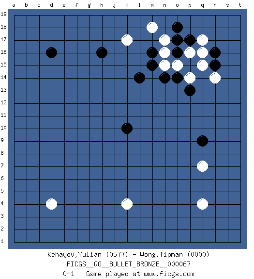 Last move : 0-1 2010 July 31 9:22:8 [Event "FICGS__GO__BULLET_BRONZE__000067"] [Site "FICGS"] [Date "2010.07.31"] [Round "1"] [Black "Kehayov,Yulian"] [White "Wong,Tipman"] [Result "0-1"] [Rating 1 "0577"] [Rating 2 "0000"] 1.r15 d4 2.d16 q4 3.k10 k4 4.q9 k17 5.m16 q7 6.h16 m18 7.o18 n17 8.o17 n16 9.n14 o15 10.o16 n15 11.l14 p14 12.o14 p16 13.m15 q15 14.p17 q17 15.r16 q16 16.p13 r14 0-1 Here are the names of the openings (joseki) played in the four corners : Corner q4 : q4 q9 Hoshi (Hwajeom, Seongjeom, Xingwei`) 4-4 Point. The star or hoshi (4-4) point, emphasizing influence at the potential expense of territory. Player White won this Go (weiqi, baduk) game. Follow this game move after move (download)The rectangular six is normally alive. (Anonymous) Big Chess is a place for big hallucinations. (Thibault de Vassal)