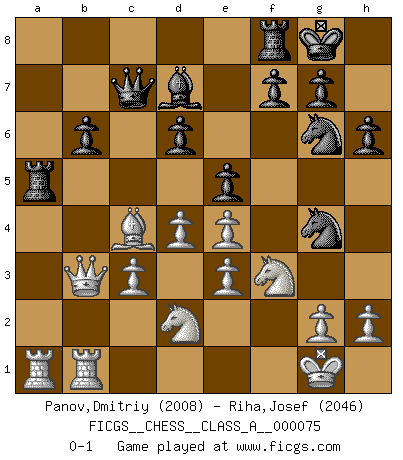 Last move : 0-1 2010 October 7 21:26:39 [Event "FICGS__CHESS__CLASS_A__000075"] [Site "FICGS"] [Date "2010.08.04"] [Round "1"] [White "Panov,Dmitriy"] [Black "Riha,Josef"] [Result "0-1"] [WhiteElo "2008"] [BlackElo "2046"] 1.e4 e5 2.Nf3 Nc6 3.Bc4 Bc5 4.c3 Nf6 5.d3 d6 6.O-O a6 7.b4 Ba7 8.a4 O-O 9.Bg5 h6 10.Be3 Bxe3 11.fxe3 Ne7 12.Nbd2 Bd7 13.a5 b5 14.axb6 cxb6 15.d4 Qc7 16.Qc2 a5 17.bxa5 Rxa5 18.Qb3 Ng6 19.Rfb1 Ng4 0-1 Giuoco Piano Kingside Castling by player White (move 6) Kingside Castling by player Black (move 8) Player Black won this chess game. Follow this game move after move (download)The King is a fighting piece. Use it ! (Wilhelm Steinitz) Der Knackpunkt bei der Konzentration ist, daß wir nur durch sie etwas Neues und Ungewöhnliches am Schachbrett finden können. Sie ist der einzige Weg durch neue neue Ideen eine Überraschung zu bereiten. (Garry Kasparov) Dejen al perfeccionista jugar por correo. (Yasser Seirawan) Donnez-moi un Cavalier en 6e et je gagnerais toutes mes parties. (Steinitz) Any activity becomes creative when the doer cares about doing it right or doing it better. (John Updike)