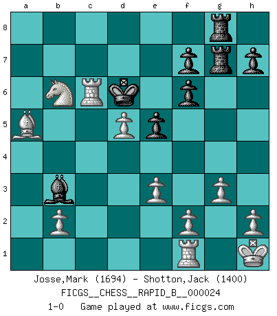 Last move : 1-0 2007 February 4 8:43:57 [Event "FICGS__CHESS__RAPID_B__000024"] [Site "FICGS"] [Date "2006.11.16"] [Round "1"] [White "Josse,Mark"] [Black "Shotton,Jack"] [Result "1-0"] [WhiteElo "1694"] [BlackElo "1400"] 1.d4 d5 2.c4 c6 3.Nf3 Nf6 4.Nc3 Bf5 5.cxd5 cxd5 6.Qb3 Qb6 7.Nxd5 Qxb3 8.Nxf6+ gxf6 9.axb3 e6 10.e3 Nc6 11.Bb5 Bd6 12.O-O Rg8 13.Kh1 a6 14.Nd2 Rc8 15.Be2 Ke7 16.Nc4 Bc7 17.Bd2 Rg7 18.Bf3 Rcg8 19.g3 Bc2 20.Bxc6 bxc6 21.Rxa6 e5 22.Ra7 Kd7 23.Ba5 Bxb3 24.Rxc7+ Ke6 25.Rxc6+ Kd5 26.Rc5+ Ke6 27.d5+ Kd7 28.Nb6+ Kd6 29.Rc6+ 1-0 This chess game has been lost on time (started : 2006.11.16 0:7:54) QGD Slav : 4.Nc3 Kingside Castling by player White (move 12) Player White won this chess game. Follow this game move after move (download)Why must I lose to this idiot ? (Aron Nimzovich) Wenn Capablanka heute auf der Schachbühne erscheinen würde, hätte er ein halbes Jahr gebraucht um sich die Schachtheorie anzueignen. Und dann hätte er alles und jeden besiegt. (Mikhail Moiseyevich Botvinik) La vida es como un juego de Ajedrez, cambiando con cada movimiento. (Proverbio Chino) Psychologiquement, tu dois avoir confiance en toi même, mais cette confiance doit être basée sur des faits. (Robert Fischer) In every real man a child is hidden that wants to play. (Friedrich Nietzsche)