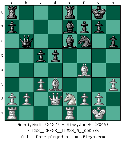 Last move : 0-1 2010 October 25 10:21:6 [Event "FICGS__CHESS__CLASS_A__000075"] [Site "FICGS"] [Date "2010.08.04"] [Round "1"] [White "Aerni,Andi"] [Black "Riha,Josef"] [Result "0-1"] [WhiteElo "2127"] [BlackElo "2046"] 1.e4 e5 2.Nf3 Nc6 3.Nc3 Nf6 4.d4 exd4 5.Nxd4 Bb4 6.Nxc6 bxc6 7.Bd3 d5 8.exd5 cxd5 9.Qe2+ Be7 10.O-O O-O 11.Re1 Re8 12.Bg5 Bg4 13.Qd2 c6 14.h3 Be6 15.Ne2 h6 16.Bf4 c5 17.c3 Qb6 0-1 This chess game has been lost on time (started : 2010.08.04 17:2:49) Four knights : Scotch, 4...exd4 Kingside Castling by player White (move 10) Kingside Castling by player Black (move 10) Player Black won this chess game. Follow this game move after move (download)We cannot resist the fascination of sacrifice, since a passion for sacrifices is part of a Chessplayer's nature. (Rudolf Spielman) Je mehr ich von der FIDE weiss, um so weniger verstehe ich. (Alexander Kalifman) De eso se trata el Ajedrez. Un día le das una lección a tu oponente y al día siguiente el te da una a tí. (Bobby Fischer) En blitz, le Cavalier l'emporte sur le Fou. (Vlastimil Hort) All the biggest technological inventions created by man - the airplane, the automobile, the computer - says little about his intelligence, but speaks volumes about his laziness. (Mark Kennedy)