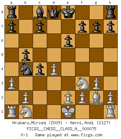 Last move : 0-1 2010 September 5 23:8:55 [Event "FICGS__CHESS__CLASS_A__000075"] [Site "FICGS"] [Date "2010.08.04"] [Round "1"] [White "Hrubaru,Mircea"] [Black "Aerni,Andi"] [Result "0-1"] [WhiteElo "2009"] [BlackElo "2127"] 1.d4 d5 2.c4 e6 3.Nf3 Nf6 4.g3 dxc4 5.Bg2 Nc6 6.Qa4 Bb4+ 7.Bd2 Nd5 8.Bxb4 Ndxb4 9.a3 b5 10.Qxb4 Nxb4 0-1 Queen's gambit declined Player Black won this chess game. Follow this game move after move (download)Without error there can be no brilliancy. (Emanuel Lasker) Ich weiss nicht was Gott gegen mich auf 1.e4 antworten würde. (Robert James Fischer) El Ajedrez es realmente noventa y nueve por ciento calculación. (Soltis) Si le désir cupide (et stupide) de gagner est une inépuisable source de souffrance, une combinaison brillante sur l'échiquier est une découverte : le coquelicot qui s'épanouit lorsque apparaît la Voie Lactée. (Arrabal) The arrogant army will lose certainly the battle. (Chinese proverb)
