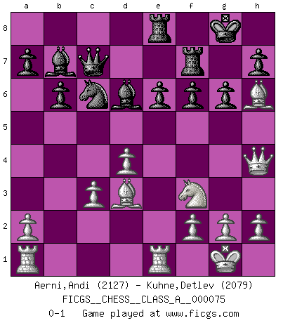 Last move : 0-1 2010 November 1 21:42:48 [Event "FICGS__CHESS__CLASS_A__000075"] [Site "FICGS"] [Date "2010.08.04"] [Round "1"] [White "Aerni,Andi"] [Black "Kuhne,Detlev"] [Result "0-1"] [WhiteElo "2127"] [BlackElo "2079"] 1.e4 c5 2.c3 Nf6 3.e5 Nd5 4.Nf3 e6 5.d4 cxd4 6.cxd4 d6 7.Nc3 Nxc3 8.bxc3 Qc7 9.Bd2 Nc6 10.exd6 Bxd6 11.Bd3 O-O 12.O-O b6 13.Qe2 Bb7 14.Qe4 g6 15.Qh4 f6 16.Rfe1 Rae8 17.Bh6 Rf7 0-1 This chess game has been lost on time (started : 2010.08.04 17:2:49) Sicilian : Alapin's variation (2.c3) Kingside Castling by player Black (move 11) Kingside Castling by player White (move 12) Player Black won this chess game. Follow this game move after move (download)It is not a move, even the best move that you must seek, but a realizable plan. (Eugene Znosko-Borovsky) Herr Iljumschinow ist ein etwas merkwürdiger Geschäftsmann: Er arbeitet zusammen mit Leuten wie Muammar al-Gaddafi; früher ist das Saddam Hussein gewesen. (Joel Lautier) Todo se encuentra en un estado de flujo y esto incluye al mundo del Ajedrez. (Mikhail Botvinnik) Aidez vos pièces, elles vous aideront. (Paul Morphy) A good programmer is someone who always looks both ways before crossing a one-way street. (Doug Linder)