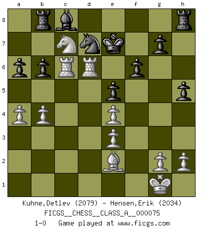 Last move : 1-0 2010 August 19 19:26:35 [Event "FICGS__CHESS__CLASS_A__000075"] [Site "FICGS"] [Date "2010.08.04"] [Round "1"] [White "Kuhne,Detlev"] [Black "Hensen,Erik"] [Result "1-0"] [WhiteElo "2079"] [BlackElo "2034"] 1.d4 Nf6 2.c4 c6 3.Nf3 d5 4.Nc3 dxc4 5.a4 e6 6.e4 c5 7.Bxc4 cxd4 8.Qxd4 Qxd4 9.Nxd4 Nbd7 10.Ndb5 Kd8 11.Bf4 e5 12.Be3 a6 13.Na3 Ke8 14.O-O Ng4 15.Nd5 Nxe3 16.fxe3 Rb8 17.Rac1 Nc5 18.b4 Nd7 19.Rf5 f6 20.Rf2 Kd8 21.Rd2 b6 22.Be2 h5 23.Nc4 Ke8 24.Nc7+ Kf7 25.Nd6+ Bxd6 26.Rxd6 Ke7 27.R1c6 1-0 Queen's pawn game Kingside Castling by player White (move 14) Player White won this chess game. Follow this game move after move (download)A thorough understanding of the typical mating continuations makes the most complicated sacrificial combinations leading up to them not only not difficult, but almost a matter of course. (Siegbert Tarrasch) Bogoljubow: Matt in vier Zügen! Tartakower: Ich verbitte mir jede Belästigung! (Savielly Grigorievitsch Tartakower) Muchos se han convertido en Maestros de Ajedrez, nadie se ha convertido en el Maestro del Ajedrez. (Siegbert Tarrasch) On peut tirer plus d'utilité d'une partie perdue que de 100 parties gagnées. (Capablanca) Man is still the most extraordinary computer of all. (John F. Kennedy)