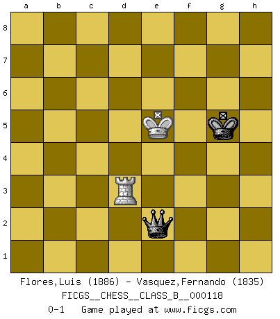 Last move : 0-1 2011 November 13 15:18:52 [Event "FICGS__CHESS__CLASS_B__000118"] [Site "FICGS"] [Date "2010.08.05"] [Round "1"] [White "Flores,Luis"] [Black "Vasquez,Fernando"] [Result "0-1"] [WhiteElo "1886"] [BlackElo "1835"] 1.d4 d5 2.c4 dxc4 3.Nc3 Nf6 4.e4 e5 5.d5 b5 6.Nf3 b4 7.Nb1 Nxe4 8.Bxc4 Bc5 9.O-O O-O 10.Qc2 Bf5 11.Ng5 Nd6 12.Bd3 Bxd3 13.Qxd3 e4 14.Qc2 Nd7 15.Bf4 Qf6 16.Bxd6 cxd6 17.Nxe4 Qf5 18.Nbd2 Qxd5 19.Nxc5 Qxc5 20.Rac1 Qxc2 21.Rxc2 Rfc8 22.Rfc1 Rxc2 23.Rxc2 Ne5 24.g3 g6 25.Kg2 a5 26.Ne4 Rd8 27.Nf6+ Kg7 28.Nd5 Nd3 29.Rd2 Nc1 30.b3 Rc8 31.Kf3 Rc5 32.Nb6 f5 33.Ke3 Rc6 34.Nd5 Kf7 35.h4 Rc5 36.Nf4 Ke7 37.Nd5+ Ke6 38.Nf4+ Kd7 39.Rb2 d5 40.Kd2 Kd6 41.h5 g5 42.Nh3 g4 43.Nf4 Rc6 44.h6 Ke5 45.Rb1 Nxa2 46.Re1+ Kf6 47.Ra1 Nc3 48.Rxa5 Kg5 49.Ke3 Ne4 50.Nxd5 Rc2 51.Ra7 Rxf2 52.Rxh7 Rf3+ 53.Kd4 Nxg3 54.Rh8 Ne2+ 55.Kc4 Nc3 56.Nxb4 Ne4 57.Nd5 Nd6+ 58.Kc5 Nf7 59.Rg8+ Kxh6 60.b4 g3 61.b5 Ng5 62.Rh8+ Kg6 63.Rh1 Rf2 64.b6 Ne4+ 65.Kc6 Rc2+ 66.Kd7 Nf6+ 67.Nxf6 Kxf6 68.Rb1 Re2 69.Kc6 Re7 70.b7 Rxb7 71.Rxb7 g2 72.Rb1 f4 73.Kd5 f3 74.Rb3 g1Q 75.Rxf3+ Kg5 76.Rd3 Qg2+ 77.Ke5 Qe2+ 0-1 Queen's gambit accepted Kingside Castling by player White (move 9) Kingside Castling by player Black (move 9) 10 pieces endgame at move 56 : White KRNPP , Black KRNPP WHITE : King + 1 Rook 1 Knight 2 Pawns BLACK : King + 1 Rook 1 Knight 2 Pawns 9 pieces endgame at move 59 : White KRNP , Black KRNPP WHITE : King + 1 Rook 1 Knight 1 Pawn BLACK : King + 1 Rook 1 Knight 2 Pawns 8 pieces endgame at move 67 : White KRNP , Black KRPP WHITE : King + 1 Rook 1 Knight 1 Pawn BLACK : King + 1 Rook 2 Pawns 7 pieces endgame at move 67 : White KRP , Black KRPP WHITE : King + 1 Rook 1 Pawn BLACK : King + 1 Rook 2 Pawns 6 pieces endgame at move 70 : White KR , Black KRPP WHITE : King + 1 Rook BLACK : King + 1 Rook 2 Pawns 5 pieces endgame at move 71 : White KR , Black KPP WHITE : King + 1 Rook BLACK : King + 2 Pawns Promotion Queen by player Black (move 74) 4 pieces endgame at move 75 : White KR , Black KQ WHITE : King + 1 Rook BLACK : King + 1 Queen Player Black won this chess game. Follow this game move after move (download)He who fears an isolated Queen's Pawn should give up Chess. (Siegbert Tarrasch) Es tut gut, die Entwicklungsperiode von, [...] demokratischem Geist durchdringen zu lassen. Wie undemokratisch wäre es doch beispielsweise, den einen Offizier große Spaziertouren vornehmen zu lassen, während die anderen zu Hause säßen und sich entsetzlich langweilten. (Aaron Nimzowitsch) Las combinaciones han sido siempre el aspecto más intrigante del Ajedrez. Los Maestros las buscan, el público las aplauden, los crÃticos las alaban. La razón se debe a que las combinaciones hacen posible que el Ajedrez sea más que un ejercicio matemático con una carencia de vida. Ellas son la poesÃa del juego, son del Ajedrez lo que la melodÃa es de la música. Ellas representan el triunfo de la mente sobre la materia. (Reuben Fine) Il s'avisa de me proposer d'apprendre les échecs qu'il jouait un peu... me voilà forcené des échecs. J'achète un échiquier, je m'enferme dans ma chambre, j'y passe des jours et des nuits à vouloir apprendre par cœur toutes les parties. (Jean-Jacques Rousseau, Confessions) Empty your mind, be formless, shapeless — like water. (Bruce Lee)