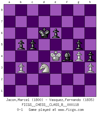 Last move : 0-1 2011 July 14 20:22:16 [Event "FICGS__CHESS__CLASS_B__000118"] [Site "FICGS"] [Date "2010.08.05"] [Round "1"] [White "Jacon,Marcel"] [Black "Vasquez,Fernando"] [Result "0-1"] [WhiteElo "1800"] [BlackElo "1835"] 1.d4 d5 2.Nc3 Nf6 3.e4 Nxe4 4.Nxe4 dxe4 5.f3 e5 6.Be3 exd4 7.Qxd4 Qxd4 8.Bxd4 Nc6 9.O-O-O Nxd4 10.Rxd4 Bf5 11.fxe4 Bc5 12.Rd5 Be3+ 13.Kb1 Be6 14.Rd1 Rd8 15.Bd3 O-O 16.Nf3 Rfe8 17.Rhf1 h6 18.b3 g6 19.e5 Kg7 20.Bc4 Rxd1+ 21.Rxd1 Bg4 22.h3 Bc8 23.Kb2 Bf4 24.Kc3 h5 25.Rf1 Bf5 26.Re1 g5 27.e6 Bxe6 28.Bxe6 fxe6 29.Kd3 c5 30.Ke4 Rd8 31.g4 h4 32.a4 Kf6 33.Rf1 Rd5 34.Rb1 Kf7 35.a5 Kf6 36.Ra1 a6 37.Rb1 Rd8 38.Rf1 Kg7 39.Rg1 Rd7 40.c3 Kh6 41.Rb1 Bc7 42.Re1 Bxa5 43.Re3 Bc7 44.Ne1 Rd2 45.Nf3 Rd1 46.Re1 Rxe1+ 47.Nxe1 Kg6 48.Nd3 Bd6 49.c4 Kf6 50.Ne1 Ke7 51.Nc2 Bf4 52.Ne1 b5 53.Nd3 Kd6 54.cxb5 axb5 0-1 Blackmar-Diemer gambit Queenside Castling by player White (move 9) Kingside Castling by player Black (move 15) Player Black won this chess game. Follow this game move after move (download)Why must I lose to this idiot ? (Aron Nimzovich) Wenn Capablanka heute auf der Schachbühne erscheinen würde, hätte er ein halbes Jahr gebraucht um sich die Schachtheorie anzueignen. Und dann hätte er alles und jeden besiegt. (Mikhail Moiseyevich Botvinik) Hay dos clases de hombres: aquellos que se conforman en dejarse llevar por las circunstancias y que juegan barajas y aquellos decididos a controlar las circunstancias y que juegan al Ajedrez. (Mortimer Collins) Psychologiquement, tu dois avoir confiance en toi même, mais cette confiance doit être basée sur des faits. (Robert Fischer) Kids, you tried your best and you failed miserably. The lesson is, never try. (Simpsons)