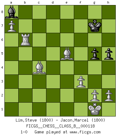 Last move : 1-0 2010 September 15 13:43:16 [Event "FICGS__CHESS__CLASS_B__000118"] [Site "FICGS"] [Date "2010.08.05"] [Round "1"] [White "Lim,Steve"] [Black "Jacon,Marcel"] [Result "1-0"] [WhiteElo "1800"] [BlackElo "1800"] 1.e4 c5 2.Nf3 Nc6 3.d4 cxd4 4.Nxd4 Nxd4 5.Qxd4 Nf6 6.e5 Ng8 7.Na3 e6 8.Nb5 a6 9.Nd6+ Bxd6 10.exd6 Nf6 11.Bd3 O-O 12.O-O b6 13.c4 Rb8 14.b4 h6 15.a4 Bb7 16.f3 a5 17.b5 Nh5 18.Be3 Ba8 19.Rfc1 Nf6 20.Qe5 Rc8 21.Rc3 Ne8 22.Rac1 Bb7 23.c5 bxc5 24.Rxc5 Rxc5 25.Rxc5 Qh4 26.Qd4 Qd8 27.Rc1 Bd5 28.Qb6 Qa8 29.Bd2 Bb3 30.Qd4 Qd8 31.Rb1 Ba2 32.Rb2 Bd5 33.b6 Qa8 34.Rb5 Qb8 35.Rxa5 Nf6 36.Ra7 e5 37.Qb2 Qxd6 38.Qb4 Qb8 39.Rc7 Ne8 40.Rxd7 Be6 41.Ra7 Nf6 42.a5 Rd8 43.Qc3 Qd6 44.b7 Bd5 45.Bf1 e4 46.Qb4 Qe5 47.Bc3 Qf4 48.Be1 Kh7 49.a6 Qc1 50.Qc3 Qb1 51.Bf2 e3 52.Bxe3 Nd7 53.Qd3+ Qxd3 54.Bxd3+ g6 55.Bb5 Nf6 56.Bf4 Kg7 57.Bc7 Rf8 58.b8Q Rxb8 59.Bxb8 h5 60.Be5 Be6 61.Rc7 Bd5 62.a7 Ba8 63.Bc4 g5 64.Rxf7+ Kh6 65.Rxf6+ Kg7 66.Rb6 1-0 Sicilian defense Kingside Castling by player Black (move 11) Kingside Castling by player White (move 12) Promotion Queen by player White (move 58) Player White won this chess game. Follow this game move after move (download)Good positions don't win games, good moves do. (Gerald Abrahams) Schach ist mein Leben, meine Leidenschaft, was ich gelernt habe und seit meinem 14. Lebensjahr profimässig praktiziere. Darauf zu verzichten, würde mir sehr schwer fallen. (Viktor Kortschnoi) El Ajedrez es la vida. (Bobby Fischer) Je crois qu'il existe des manières très spécifiques de jouer efficacement contre une machine. Evidemment, nous n'avons aucune chance en technique pure, parce que l'ordinateur calcule de manière parfaite. Mais lorsque nous faisons appel à notre cerveau, en utilisant l'intuition et la compréhension, alors nous restons beaucoup plus forts. (Anatoli Karpov) Pushing plastic is for the many, pushing virtual pieces is for the fewer, pushing wood is for the very few. (Normajean Yates)
