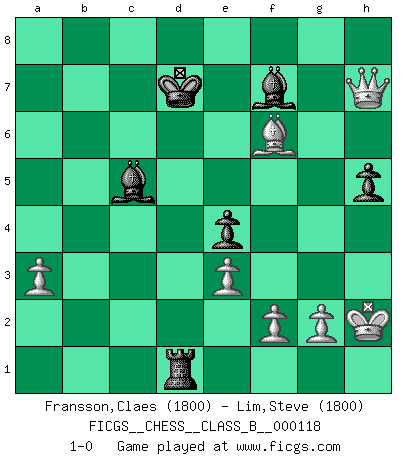 Last move : 1-0 2011 March 6 3:37:8 [Event "FICGS__CHESS__CLASS_B__000118"] [Site "FICGS"] [Date "2010.08.05"] [Round "1"] [White "Fransson,Claes"] [Black "Lim,Steve"] [Result "1-0"] [WhiteElo "1800"] [BlackElo "1800"] 1.d4 Nf6 2.c4 g6 3.Nc3 d5 4.Bf4 Bg7 5.e3 O-O 6.Rc1 c6 7.Nf3 Qb6 8.cxd5 Nxd5 9.Nxd5 cxd5 10.Qd2 Nc6 11.Be2 Bf5 12.a3 Rac8 13.b4 a5 14.b5 Na7 15.O-O Rxc1 16.Rxc1 Nxb5 17.Qb2 Nxd4 18.Qxb6 Nxe2+ 19.Kh1 Nxc1 20.Qxb7 Nd3 21.Bg3 Rc8 22.Qxd5 Rc1+ 23.Ng1 Rc5 24.Qd8+ Bf8 25.h4 e5 26.Nf3 h6 27.h5 gxh5 28.Qf6 e4 29.Ne5 Be6 30.Ng6 Bg7 31.Qd8+ Kh7 32.Ne7 f6 33.Qd4 Rc4 34.Qb6 Bf7 35.Qxa5 Rc5 36.Qa4 Rc4 37.Qd7 Bf8 38.Nc6 Kg8 39.Nd8 Rc1+ 40.Kh2 Bb3 41.Ne6 Nc5 42.Nxc5 Bxc5 43.Qc6 Bf7 44.Qxf6 Rd1 45.Be5 Kf8 46.Qxh6+ Ke7 47.Bf6+ Kd7 48.Qh7 1-0 King's Indian defense, 3.Nc3 Kingside Castling by player Black (move 5) Kingside Castling by player White (move 15) Player White won this chess game. Follow this game move after move (download)All that matters on the Chessboard is good moves. (Bobby Fischer) Schach ist das schnellste Spiel der Welt, weil man in jeder Sekunde Tausende von Gedanken ordnen muß. (Albert Einstein) Muchos se han convertido en Maestros de Ajedrez, nadie se ha convertido en el Maestro del Ajedrez. (Siegbert Tarrasch) C'est une question de caractère, Beaucoup de gens perdent leur motivation très vite. D'autres, ils sont rares, peuvent la conserver très longtemps. J'aime les échecs, encore aujourd'hui je suis heureux d'analyser des parties. J'aime toujours gagner, je déteste encore perdre. Bien jouer est important pour mon intégrité intellectuelle et morale. Et puis les échecs vivent en ce moment une période historique grâce à Internet. Ils se développent dans les systèmes éducatifs à travers le monde. Ils sortent de leur ghetto, et c'est mon rôle de mener à bien cette révolution. (Gary Kasparov) Once you start thinking you have nothing left to learn, you have everything to learn. (Steve Badget)