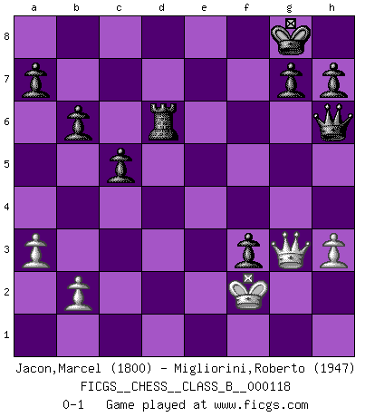 Last move : 0-1 2010 September 15 15:2:10 [Event "FICGS__CHESS__CLASS_B__000118"] [Site "FICGS"] [Date "2010.08.05"] [Round "1"] [White "Jacon,Marcel"] [Black "Migliorini,Roberto"] [Result "0-1"] [WhiteElo "1800"] [BlackElo "1947"] 1.d4 d5 2.Nc3 Nf6 3.e4 dxe4 4.f3 exf3 5.Nxf3 Bf5 6.Bd3 Bxd3 7.cxd3 c6 8.O-O e6 9.Qe1 Nbd7 10.Ne5 Nxe5 11.dxe5 Qd4+ 12.Kh1 Nd7 13.Bf4 Qxd3 14.Rd1 Qg6 15.Rd2 Be7 16.Ne4 Bb4 17.a3 Bxd2 18.Bxd2 O-O 19.Bc3 b6 20.Kg1 Rad8 21.Qe2 c5 22.Nd6 Nb8 23.Qd1 Nc6 24.Rf4 Qg5 25.g3 Nxe5 26.Kf1 Ng6 27.Rf2 f5 28.Rd2 f4 29.g4 f3 30.Qe1 Qxg4 31.Qg3 Qa4 32.Kf2 e5 33.h3 Rf6 34.Bxe5 Nxe5 35.Qxe5 Qh4+ 36.Qg3 Qh6 37.Rd1 Rfxd6 38.Rxd6 Rxd6 0-1 Blackmar-Diemer gambit Kingside Castling by player White (move 8) Kingside Castling by player Black (move 18) Player Black won this chess game. Follow this game move after move (download)By playing at Chess then, we may learn: First: Foresight... Second: Circumspection... Third: Caution... And lastly, we learn by Chess the habit of not being discouraged by present bad appearances in the state of our affairs, the habit of hoping for a favorable chance, and that of persevering in the secrets of resources. (Benjamin Franklin) Charakterschwächen offenbaren sich normalerweise während einer Schachpartie. (Garry Kasparov) Las combinaciones han sido siempre el aspecto más intrigante del Ajedrez. Los Maestros las buscan, el público las aplauden, los críticos las alaban. La razón se debe a que las combinaciones hacen posible que el Ajedrez sea más que un ejercicio matemático con una carencia de vida. Ellas son la poesía del juego, son del Ajedrez lo que la melodía es de la música. Ellas representan el triunfo de la mente sobre la materia. (Reuben Fine) Si je n'étais pas joueur d'échecs, je serais le meilleur dans quelque chose d'autre. (Anatoli Karpov) The Internet is the world's largest library. It's just that all the books are on the floor. (John Allen Paulos)