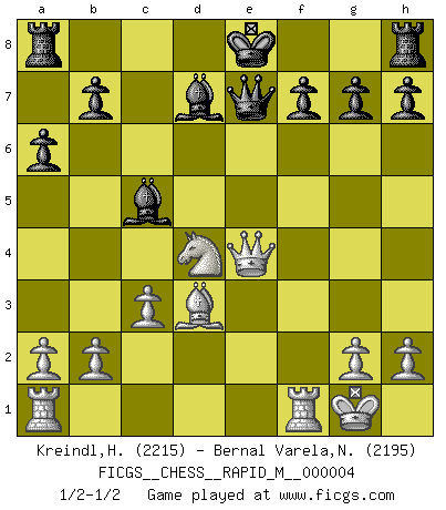 Last move : 1/2-1/2 2007 January 7 18:17:48 [Event "FICGS__CHESS__RAPID_M__000004"] [Site "FICGS"] [Date "2006.11.16"] [Round "1"] [White "Kreindl,Helmut"] [Black "Bernal Varela,Nelson"] [Result "1/2-1/2"] [WhiteElo "2215"] [BlackElo "2195"] 1.e4 c5 2.c3 d5 3.exd5 Qxd5 4.d4 Nf6 5.Nf3 e6 6.Na3 Nc6 7.Be3 Ng4 8.Nb5 Nxe3 9.fxe3 Qd8 10.Bd3 a6 11.Na3 cxd4 12.exd4 e5 13.Nc2 exd4 14.Ncxd4 Nxd4 15.Nxd4 Bc5 16.Qe2+ Qe7 17.Qe4 Bd7 18.O-O 1/2-1/2 Sicilian : Alapin's variation (2.c3) Kingside Castling by player White (move 18) This chess game ended in a draw. Follow this game move after move (download)All my games are real. (Bobby Fischer) Darum geht es im Schach. Einen Tag gibst du deinem Gegner eine Lektion, am nächsten Tag gibt er dir eine. (Robert James Fischer) El juego de Fischer siempre fue nítido, racional y brillante. Uno de los mejores por siempre. (Dave Regis) Les échecs, c'est l'imagination. (David Bronstein) Don't be irreplaceable, if you can't be replaced, you can't be promoted. (Dan Rotaru)