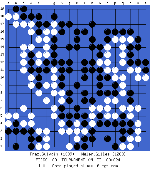 Last move : 1-0 2010 September 25 1:27:32 [Event "FICGS__GO__TOURNAMENT_KYU_II__000024"] [Site "FICGS"] [Date "2010.08.05"] [Round "1"] [Black "Praz,Sylvain"] [White "Meier,Gilles"] [Result "1-0"] [Rating 1 "1389"] [Rating 2 "1283"] 1.r16 d4 2.q3 d16 3.f17 c14 4.m17 r5 5.r8 p5 6.o4 o5 7.n4 s3 8.q11 k3 9.r4 s4 10.q5 q6 11.q4 s6 12.p6 p7 13.n5 o6 14.r7 r6 15.k5 h4 16.d18 c17 17.h16 d10 18.c3 c4 19.d3 e3 20.e2 f2 21.b4 b5 22.c5 d5 23.b3 c6 24.d2 f3 25.p16 k10 26.h6 f7 27.d13 c13 28.d12 c12 29.g13 g10 30.m12 j13 31.k15 l13 32.m14 m13 33.n13 l14 34.m15 l15 35.l16 n12 36.n11 o12 37.m11 o13 38.n14 o11 39.n9 o9 40.o10 p10 41.n10 p11 42.p9 q9 43.p8 q8 44.o8 q10 45.j11 k11 46.h12 j10 47.h10 k12 48.h9 n6 49.l8 k8 50.l7 k7 51.k6 h7 52.g7 g6 53.j7 h14 54.g14 h15 55.g15 j15 56.k16 j16 57.j17 h13 58.k14 h8 59.j8 g8 60.g12 q14 61.r13 q12 62.r12 r11 63.r14 q15 64.q16 r15 65.s15 s11 66.s14 q13 67.m3 d14 68.d11 c11 69.f11 j9 70.k9 g16 71.h17 f16 72.e16 e15 73.e17 f15 74.e10 d9 75.j12 k13 76.e9 g9 77.h11 e8 78.c18 g11 79.l10 e13 80.f12 e12 81.e11 f14 82.l11 g17 83.g18 e1 84.b1 b18 85.d1 f1 86.b19 b17 87.h5 g5 88.j4 j3 89.l2 r2 90.q2 l3 91.m2 k4 92.p4 k2 93.s12 m5 94.l4 m4 95.l5 m6 96.o2 p15 97.o16 o7 98.j5 h3 99.t11 t10 100.t12 s10 101.n8 d17 102.e18 o14 103.o15 f9 104.l12 f13 105.j14 r1 106.k1 j1 107.l1 q1 108.p1 a4 109.a3 a5 110.r3 s2 111.m7 a18 112.c19 pass 113.pass 1-0 Here are the names of the openings (joseki) played in the four corners : Corner d16 : d16 f17 Hoshi (Hwajeom, Seongjeom, Xingwei`) 4-4 Point. The star or hoshi (4-4) point, emphasizing influence at the potential expense of territory. Ikken Kakari (Hankan Keolch'im, Yi Gua`jiao~, 1-Space Low Approach). Black 2 is the standard approach move to the 4-4. Corner q4 : q3 r5 Komoku (Somok, Xiao~mu`) 3-4 Point. The komoku (3-4) point is the traditional corner enclosure move.. Ikken Kakari (Hankan Keolch'im, Yi Gua`jiao~, 1-Space Low Pincer). The small knight move is the basic approach move to the 3-4 point stone. It has been continually used for over four centuries. There are limitless variations, with new moves constantly being discovered. White 2 opens the door to a treaure store of joseki. Player Black won this Go (weiqi, baduk) game. Follow this game move after move (download)You have to like to win, and to learn to recognize the errors that gave you the victory. (Pierre Audouard) Drag your thoughts away from your troubles... by the ears, by the heels, or any other way you can manage it. (Mark Twain)