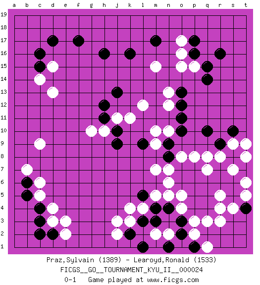 Last move : 0-1 2010 November 3 2:9:4 [Event "FICGS__GO__TOURNAMENT_KYU_II__000024"] [Site "FICGS"] [Date "2010.08.05"] [Round "1"] [Black "Praz,Sylvain"] [White "Learoyd,Ronald"] [Result "0-1"] [Rating 1 "1389"] [Rating 2 "1533"] 1.r16 d4 2.d17 q3 3.q5 r5 4.r6 r4 5.q6 o4 6.q10 d15 7.c15 c14 8.c16 d13 9.f17 c9 10.p17 j3 11.k16 p15 12.q14 o17 13.p16 o16 14.q15 o15 15.o13 m15 16.m17 n13 17.o12 n12 18.o11 l12 19.h16 m10 20.c3 d3 21.c4 c5 22.b5 c6 23.b6 b7 24.d2 e2 25.c2 e3 26.m3 m5 27.o3 p3 28.n4 n5 29.p4 o5 30.o2 l4 31.l3 k3 32.k2 j2 33.l1 p2 34.m4 n2 35.n1 m2 36.p1 q1 37.q4 r3 38.s5 s4 39.s6 o8 40.o7 p8 41.o6 m7 42.n8 n7 43.n9 p6 44.p7 q7 45.p5 n6 46.p6 r8 47.s8 s9 48.r7 q8 49.r9 t5 50.t4 t8 51.t7 s7 52.l5 k4 53.s8 t9 54.s10 s7 55.j13 t6 56.j10 j11 57.h11 h10 58.h12 k11 59.j9 g10 60.l9 n10 61.o10 m9 0-1 Here are the names of the openings (joseki) played in the four corners : Corner q4 : q3 q5 Komoku (Somok, Xiao~mu`) 3-4 Point. The komoku (3-4) point is the traditional corner enclosure move.. Ikken Takagakari (Hankan Nop'dakeolch'im, Yi Gaogua`jiao~, 1-Space High Approach). The 5-4 approach move has become more popular in modern times, as modern Go emphasizes speed and influence. Corner d16 : d17 d15 Komoku (Somok, Xiao~mu`) 3-4 Point. The komoku (3-4) point is the traditional corner enclosure move.. Ikken Takagakari (Hankan Nop'dakeolch'im, Yi Gaogua`jiao~, 1-Space High Approach). The 5-4 approach move has become more popular in modern times, as modern Go emphasizes speed and influence. Player White won this Go (weiqi, baduk) game. Follow this game move after move (download)Keep sente in the opening. A premature attack loses sente. (Anonymous) I'm extremely disappointed. I send you out for exciting, new designer drugs, you come back with tomato sauce. (Gregory House, House M.D.)