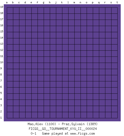 Last move : 0-1 2010 September 4 23:8:28 [Event "FICGS__GO__TOURNAMENT_KYU_II__000024"] [Site "FICGS"] [Date "2010.08.05"] [Round "1"] [Black "Mao,Alex"] [White "Praz,Sylvain"] [Result "0-1"] [Rating 1 "1100"] [Rating 2 "1389"] 0-1 This go game has been lost on time (started : 2010.08.05 19:7:21) Here are the names of the openings (joseki) played in the four corners : Player White won this Go (weiqi, baduk) game. Follow this game move after move (download)Keep away from thickness. (Anonymous) Gambling : The sure way of getting nothing from something. (Wilson Mizner)