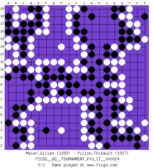 Last move : 0-1 2010 October 4 20:2:9 [Event "FICGS__GO__TOURNAMENT_KYU_II__000024"] [Site "FICGS"] [Date "2010.08.05"] [Round "1"] [Black "Meier,Gilles"] [White "Pillon,Thibault"] [Result "0-1"] [Rating 1 "1283"] [Rating 2 "1927"] 1.q16 d4 2.d16 r4 3.k16 p4 4.d10 r14 5.q14 q13 6.r15 p14 7.q15 s14 8.p13 q12 9.o14 p12 10.o13 r17 11.q17 s16 12.s15 t15 13.c6 f17 14.e17 f16 15.c14 j17 16.k17 h14 17.f3 d6 18.d7 e6 19.c3 c5 20.b6 d3 21.b5 c4 22.b3 h3 23.n3 l3 24.n5 q7 25.n7 l5 26.p2 c12 27.d12 d11 28.c11 e11 29.c10 d13 30.r2 b12 31.b11 a15 32.b15 a14 33.a13 b13 34.c13 b14 35.a16 e12 36.c16 d14 37.c15 b17 38.b16 f18 39.e18 c18 40.c17 d18 41.e19 b18 42.d19 e16 43.d17 d15 44.a18 b19 45.a17 e7 46.d8 k14 47.l15 l14 48.m14 l7 49.n9 p9 50.m10 k11 51.k9 h7 52.o4 f19 53.p5 q4 54.j9 q18 55.p18 r19 56.p19 j18 57.k18 s3 58.s2 m2 59.n2 d2 60.c2 h9 61.j10 j11 62.h10 g9 63.j8 j7 64.h8 g8 65.g10 g12 66.m13 j16 67.q19 r18 68.r16 s17 69.q6 r6 70.p7 r7 71.p8 q9 72.f10 k19 73.l19 j19 74.m18 b4 75.a4 o12 76.n12 c1 77.b1 d1 78.f8 f7 79.f9 g7 80.o11 p11 81.o10 k15 82.l16 q5 83.p6 q8 84.p10 q10 85.m3 l2 86.m4 l4 87.m6 l6 88.r3 t4 89.l8 m7 90.m8 m5 91.l12 l11 92.m11 k12 93.p3 l13 94.h11 h12 95.l10 t2 96.s1 n1 97.o1 m1 98.f11 f12 99.t18 o9 100.o8 e10 101.e9 q3 102.q2 a11 103.a10 a12 104.n6 k7 0-1 Here are the names of the openings (joseki) played in the four corners : Corner q16 : q16 r14 Hoshi (Hwajeom, Seongjeom, Xingwei`) 4-4 Point. The star or hoshi (4-4) point, emphasizing influence at the potential expense of territory. Ikken Kakari (Hankan Keolch'im, Yi Gua`jiao~, 1-Space Low Approach). White 2 is the standard approach move to the 4-4. Corner d4 : d4 c6 Hoshi (Hwajeom, Seongjeom, Xingwei`) 4-4 Point. The star or hoshi (4-4) point, emphasizing influence at the potential expense of territory. Ikken Kakari (Hankan Keolch'im, Yi Gua`jiao~, 1-Space Low Approach). Black 2 is the standard approach move to the 4-4. Corner d16 : d16 f17 Hoshi (Hwajeom, Seongjeom, Xingwei`) 4-4 Point. The star or hoshi (4-4) point, emphasizing influence at the potential expense of territory. Ikken Kakari (Hankan Keolch'im, Yi Gua`jiao~, 1-Space Low Approach). White 2 is the standard approach move to the 4-4. Player White won this Go (weiqi, baduk) game. Follow this game move after move (download)If you don't know ladders, don't play go. (Anonymous) A good aphorism is too hard for the tooth of time, and is not worn away with the centuries, although it serves as food for every speech. (Friedrich Nietzsche)
