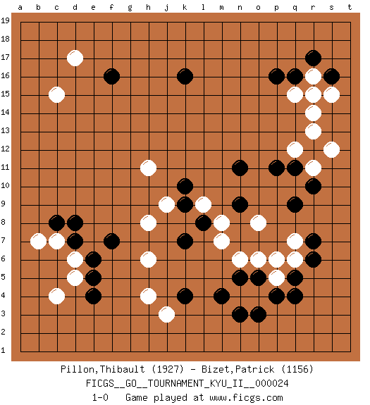 Last move : 1-0 2010 October 7 13:44:45 [Event "FICGS__GO__TOURNAMENT_KYU_II__000024"] [Site "FICGS"] [Date "2010.08.05"] [Round "1"] [Black "Pillon,Thibault"] [White "Bizet,Patrick"] [Result "1-0"] [Rating 1 "1927"] [Rating 2 "1156"] 1.q16 c4 2.q4 d17 3.e4 h4 4.d7 d5 5.e5 d6 6.e6 c7 7.c8 b7 8.d8 c15 9.k16 r14 10.r12 r16 11.r17 q15 12.s16 r15 13.p16 q12 14.q11 r11 15.p11 s12 16.r10 r13 17.q9 s15 18.k4 h6 19.m4 o4 20.o3 o6 21.p4 n4 22.n3 o8 23.n11 m7 24.k7 h8 25.f7 l9 26.k9 j9 27.k10 q7 28.r7 p5 29.q5 q6 30.r6 h11 31.f16 j3 32.n5 n6 33.o5 p6 34.l8 m8 35.n9 1-0 Here are the names of the openings (joseki) played in the four corners : Corner d4 : c4 e4 Komoku (Somok, Xiao~mu`) 3-4 Point. The komoku (3-4) point is the traditional corner enclosure move.. Ikken Takagakari (Hankan Nop'dakeolch'im, Yi Gaogua`jiao~, 1-Space High Approach). The 5-4 approach move has become more popular in modern times, as modern Go emphasizes speed and influence. Corner q16 : q16 r14 Hoshi (Hwajeom, Seongjeom, Xingwei`) 4-4 Point. The star or hoshi (4-4) point, emphasizing influence at the potential expense of territory. Ikken Kakari (Hankan Keolch'im, Yi Gua`jiao~, 1-Space Low Approach). White 2 is the standard approach move to the 4-4. Player Black won this Go (weiqi, baduk) game. Follow this game move after move (download)Don't defend - extend ! (Bill Taylor) Men should grow up. - Yeah. And dogs should stop licking themselves. It's not gonna happen. (Gregory House to Dr. Cameron, House M.D.)