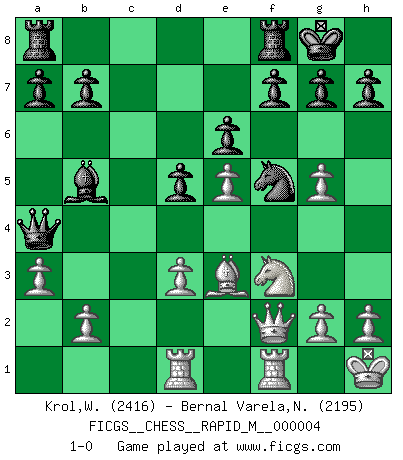 Last move : 1-0 2007 February 15 22:29:16 [Event "FICGS__CHESS__RAPID_M__000004"] [Site "FICGS"] [Date "2006.11.16"] [Round "1"] [White "Krol,Wladyslaw"] [Black "Bernal Varela,Nelson"] [Result "1-0"] [WhiteElo "2416"] [BlackElo "2195"] 1.e4 c5 2.f4 e6 3.Nf3 Nf6 4.Nc3 d5 5.e5 Ng4 6.Be2 Qb6 7.Ng5 Nh6 8.O-O Be7 9.Kh1 Nc6 10.a3 Bxg5 11.fxg5 Nf5 12.Na4 Qc7 13.Nxc5 Ncd4 14.Nd3 Nxe2 15.Qxe2 Qxc2 16.Ne1 Qb3 17.d3 O-O 18.Nf3 Bd7 19.Be3 Bb5 20.Rad1 Qa4 21.Qf2 1-0 This chess game has been lost on time (started : 2006.11.16 7:37:49) Sicilian : Grand Prix attack Kingside Castling by player White (move 8) Kingside Castling by player Black (move 17) Player White won this chess game. Follow this game move after move (download)In Chess, at least, the brave inherit the earth. (Edmar Mednis) Du musst nicht gut spielen, es reicht, wenn du besser spielst als dein Gegner. (Anonymous) El Ajedrez por encima de todo... ¡es una pelea!. (Emanuel Lasker) Soyez une menace à chaque fois que vous vous asseyez pour jouer. (Ken Smith) I don't believe in psychology. I believe in good moves. (Bobby Fischer)