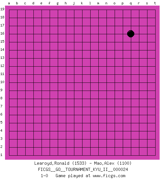 Last move : 1-0 2010 September 5 11:14:41 [Event "FICGS__GO__TOURNAMENT_KYU_II__000024"] [Site "FICGS"] [Date "2010.08.05"] [Round "1"] [Black "Learoyd,Ronald"] [White "Mao,Alex"] [Result "1-0"] [Rating 1 "1533"] [Rating 2 "1100"] 1.q16 1-0 This go game has been lost on time (started : 2010.08.05 19:7:21) Here are the names of the openings (joseki) played in the four corners : Player Black won this Go (weiqi, baduk) game. Follow this game move after move (download)Go is to western chess what philosophy is to double entry accounting. (from Shibumi, by Trevanian) If you work for a living, why do you kill yourself working ? (Tuco to a chicken in The Good, The Bad and The Ugly)