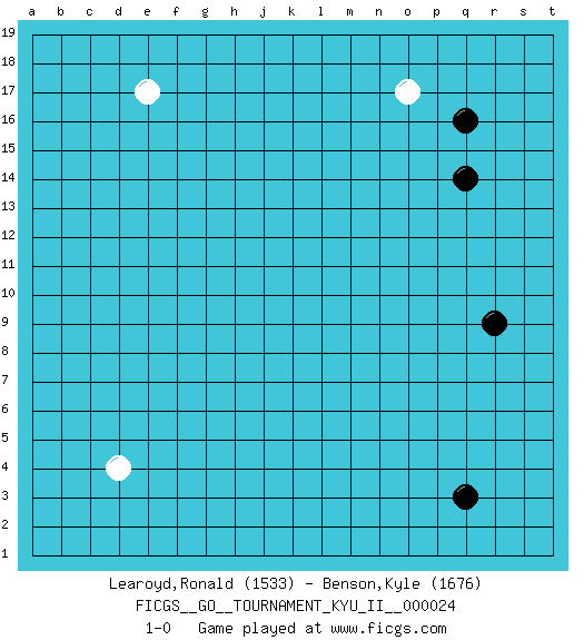 Last move : 1-0 2010 September 20 9:1:0 [Event "FICGS__GO__TOURNAMENT_KYU_II__000024"] [Site "FICGS"] [Date "2010.08.05"] [Round "1"] [Black "Learoyd,Ronald"] [White "Benson,Kyle"] [Result "1-0"] [Rating 1 "1533"] [Rating 2 "1676"] 1.q16 d4 2.q3 e17 3.r9 o17 4.q14 1-0 This go game has been lost on time (started : 2010.08.05 19:7:21) Here are the names of the openings (joseki) played in the four corners : Corner q16 : q16 o17 Hoshi (Hwajeom, Seongjeom, Xingwei`) 4-4 Point. The star or hoshi (4-4) point, emphasizing influence at the potential expense of territory. Ikken Kakari (Hankan Keolch'im, Yi Gua`jiao~, 1-Space Low Approach). White 2 is the standard approach move to the 4-4. Player Black won this Go (weiqi, baduk) game. Follow this game move after move (download)Don't make territory near thickness. (Anonymous) Imagination is more important than knowledge. Knowledge is limited. Imagination encircles the world. (Albert Einstein)