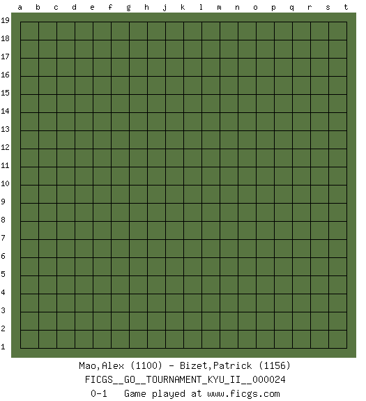 Last move : 0-1 2010 September 4 23:8:28 [Event "FICGS__GO__TOURNAMENT_KYU_II__000024"] [Site "FICGS"] [Date "2010.08.05"] [Round "1"] [Black "Mao,Alex"] [White "Bizet,Patrick"] [Result "0-1"] [Rating 1 "1100"] [Rating 2 "1156"] 0-1 This go game has been lost on time (started : 2010.08.05 19:7:21) Here are the names of the openings (joseki) played in the four corners : Player White won this Go (weiqi, baduk) game. Follow this game move after move (download)The monkey jump is worth eight points. (Anonymous) Programming can only do so much before it becomes too much. (Don Groves)