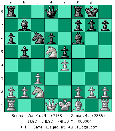 Last move : 0-1 2007 February 24 23:45:41 [Event "FICGS__CHESS__RAPID_M__000004"] [Site "FICGS"] [Date "2006.11.16"] [Round "1"] [White "Bernal Varela,Nelson"] [Black "Zubac,Marius"] [Result "0-1"] [WhiteElo "2195"] [BlackElo "2386"] 1.e4 c5 2.Nf3 Nc6 3.d4 cxd4 4.Nxd4 Nf6 5.Nc3 e5 6.Ndb5 d6 7.Bg5 a6 8.Na3 b5 9.Nd5 Be7 10.Bxf6 Bxf6 11.c3 O-O 12.Nc2 Bb7 0-1 This chess game has been lost on time (started : 2006.11.16 7:37:49) Sicilian : Pelikan (Lasker/Sveshnikov) variation Kingside Castling by player Black (move 11) Player Black won this chess game. Follow this game move after move (download)Fischer was a master of clarity and a king of artful positioning. His opponents would see where he was going but were powerless to stop him. (Bruce Pandolfini) Frage des Reporters: -Welche besonderen Umstände rechtfertigen das Anhalten der Uhren während einer Turnierpartie? Antwort: -Einen Fotographen zu strangulieren. (Siegbert Tarrasch) Un jugador que es sorprendido, esta derrotado a medias. (Proverbio) Le succès, c'est être capable d'aller d'échec en échec sans perdre son enthousiasme. (Winston Churchill) The problem with manipulation is that people can turn on you. (Horatio Caine, C.S.I. Miami)