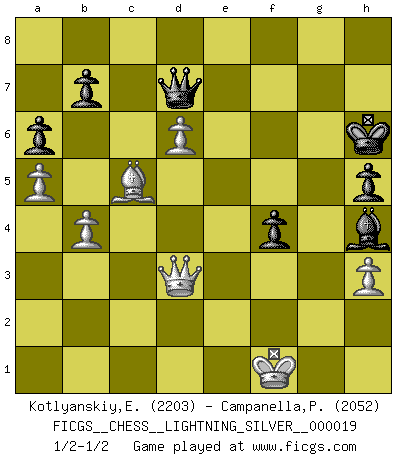 Last move : 1/2-1/2 2010 August 6 23:21:5 [Event "FICGS__CHESS__LIGHTNING_SILVER__000019"] [Site "FICGS"] [Date "2010.08.06"] [Round "1"] [White "Kotlyanskiy,Edward"] [Black "Campanella,Paul"] [Result "1/2-1/2"] [WhiteElo "2203"] [BlackElo "2052"] 1.e4 c5 2.Nf3 d6 3.d4 cxd4 4.Nxd4 Nf6 5.Nc3 a6 6.Be2 e5 7.Nb3 Be7 8.O-O O-O 9.Be3 Be6 10.Qd2 Nbd7 11.a4 Rc8 12.a5 Qc7 13.Rfd1 Rfd8 14.Nc1 Nc5 15.Nd5 Bxd5 16.exd5 Nfe4 17.Qb4 f5 18.Nb3 Nxb3 19.cxb3 Qd7 20.f3 Nf6 21.Rac1 Re8 22.Rc4 e4 23.Qc3 exf3 24.Bxf3 Rxc4 25.bxc4 Bd8 26.b4 Ne4 27.Qb3 Bf6 28.c5 Qb5 29.Bxe4 Rxe4 30.cxd6 Qd7 31.Rc1 Qxd6 32.Bc5 Qd7 33.d6 Kh8 34.Qb1 Kg8 35.Qa2+ Kh8 36.Qd2 h6 37.Re1 Rxe1+ 38.Qxe1 g5 39.Qd2 Kg7 40.Qd5 h5 41.g3 Kg6 42.Bb6 Kh6 43.Kf2 f4 44.gxf4 gxf4 45.Bc5 Bg5 46.h3 Bh4+ 47.Ke2 Bg5 48.Qd3 Bh4 49.Kf1 1/2-1/2 Sicilian : Najdorf, Opovcensky variation Kingside Castling by player White (move 8) Kingside Castling by player Black (move 8) This chess game ended in a draw. Follow this game move after move (download)Chess is above all, a fight ! (Emanuel Lasker) Woher wissen wir, daß der Neanderthaler Blindschach gespielt hat? -- Bei Ausgrabungen wurden keine Schachbretter und Figuren gefunden. (Anonymous) Aquellos que dicen que entienden al Ajedrez, no entienden nada. (Robert Hubner) Le génie consiste à savoir transgresser les règles au moment opportun. (Teichmann) Once you start thinking you have nothing left to learn, you have everything to learn. (Steve Badget)