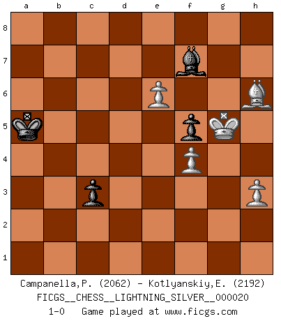 Last move : 1-0 2010 August 6 23:52:56 [Event "FICGS__CHESS__LIGHTNING_SILVER__000020"] [Site "FICGS"] [Date "2010.08.06"] [Round "1"] [White "Campanella,Paul"] [Black "Kotlyanskiy,Edward"] [Result "1-0"] [WhiteElo "2062"] [BlackElo "2192"] 1.e4 e5 2.Nf3 Nc6 3.Bb5 Nf6 4.O-O Nxe4 5.d4 Nd6 6.Bxc6 dxc6 7.dxe5 Nf5 8.Qxd8+ Kxd8 9.Nc3 Ke8 10.h3 Be7 11.Rd1 h6 12.Ne2 Nh4 13.Nxh4 Bxh4 14.Be3 f5 15.b3 Be7 16.f4 a5 17.a4 Kf7 18.Rd3 Be6 19.Rad1 Rhd8 20.Rxd8 Rxd8 21.Rxd8 Bxd8 22.c4 g6 23.Kf2 b5 24.Nd4 bxa4 25.bxa4 Bxc4 26.Nxc6 Bd5 27.Nxd8+ Ke8 28.Bd2 Kxd8 29.Bxa5 Kc8 30.Bb4 Bb3 31.a5 Kb7 32.Bf8 Ka6 33.Kg3 Kxa5 34.Kh4 Bf7 35.Bxh6 c5 36.g4 c4 37.gxf5 gxf5 38.Kg5 c3 39.e6 1-0 Ruy Lopez : Berlin defense, Open variation Kingside Castling by player White (move 4) 10 pieces endgame at move 37 : White KBPPPP , Black KBPP WHITE : King + 1 Bishop 4 Pawns BLACK : King + 1 Bishop 2 Pawns 9 pieces endgame at move 37 : White KBPPP , Black KBPP WHITE : King + 1 Bishop 3 Pawns BLACK : King + 1 Bishop 2 Pawns Player White won this chess game. Follow this game move after move (download)Fischer was a master of clarity and a king of artful positioning. His opponents would see where he was going but were powerless to stop him. (Bruce Pandolfini) Bis jetzt ist Weiß einer wohlbekannten Analyse gefolgt. Aber jetzt begeht er einen schrecklichen Fehler: Er beginnt seinen eigenen Kopf zu benutzen. (Siegbert Tarrasch) El sobresalir en el Ajedrez es un signo de una mente intrigante. (Sir Arthur Conan Doyle) On n'a jamais que l'âge auquel on a commence à jouer aux échecs car après on cesse de vieillir. (Capablanca) Beep ! (R2D2 in Star Wars ep.3)
