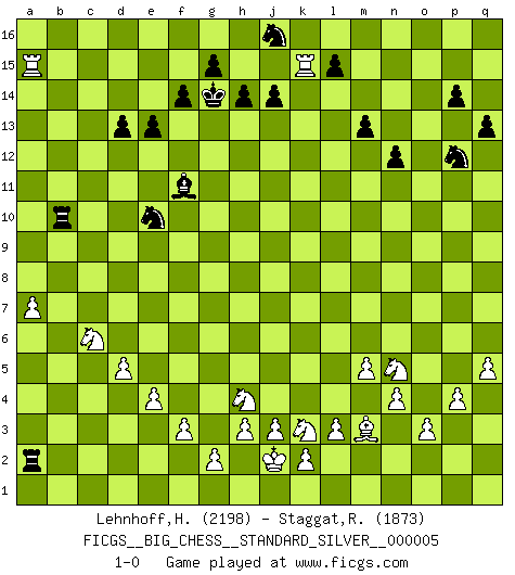 Last move : 1-0 2011 August 29 10:4:54 [Event "FICGS__BIG_CHESS__STANDARD_SILVER__000005"] [Site "FICGS"] [Date "2010.08.07"] [Round "2"] [White "Lehnhoff,Heinz-Georg"] [Black "Staggat,Rolf"] [Result "1-0"] [WhiteElo "2198"] [BlackElo "1873"] 1.j2-k4 j15-k13 2.h1-o7 h15-g13 3.o7-o15 p16-o14 4.o15-c4 b16-c14 5.m2-m4 n15-n13 6.e2-e4 m15-m13 7.d2-d4 e15-e13 8.n2-n4 d15-d13 9.h2-g4 h16-o10 10.c1-h6 o16-g9 11.o2-o3 f16-c13 12.l2-l3 l16-p12 13.k1-h2 c16-j10 14.c4-b5 b15-b14 15.g1-j2 q16-o16 16.b1-a3 k16-h15 17.b5-b11 a16-d16 18.o1-l4 o14-n12 19.l4-m5 o16-o11 20.b11-a12 g16-e15 21.p1-n2 j10-f13 22.m5-k3 m16-o16 23.n2-p3 o11-a11 24.a12-f7 n12-l11 25.f7-n7 n13-n12 26.l1-q6 l11-m9 27.n7-p5 q15-q13 28.c2-c3 h15-k14 29.p5-e5 g9-h8 30.e5-e7 j16-h15 31.q6-k12 o16-o11 32.k12-f8 k13-m14 33.k3-h5 o11-e11 34.e7-c9 m9-n11 35.j2-g3 p12-h5 36.g3-h5 a11-b11 37.a3-b5 e16-o16 38.a2-a4 o10-l10 39.f2-f3 o16-o9 40.c9-h4 d16-o16 41.f1-c4 c13-b12 42.f8-b12 c14-b12 43.h4-j5 e15-c14 44.c4-d5 h8-j9 45.j5-l5 m14-l12 46.h2-j4 e11-l11 47.l5-l10 l11-l10 48.p3-o5 a15-a13 49.p2-p4 c14-d12 50.q2-q4 n11-m9 51.j4-l5 m9-l7 52.h6-j5 l7-n6 53.l5-k7 j9-k10 54.j1-j2 o9-q9 55.m4-m5 n6-l7 56.k4-l6 f13-e12 57.k7-m8 l10-l11 58.h5-j7 l12-m10 59.m1-m4 g13-j12 60.d5-f7 b12-c10 61.m4-k4 l7-j6 62.k4-k6 j6-g5 63.f7-g8 e12-j8 64.k6-c6 g5-h7 65.j5-h4 h7-j9 66.g8-j6 j9-l10 67.m8-l10 j8-l10 68.e1-m1 l10-k11 69.m1-m4 c15-c13 70.q4-q5 q9-a9 71.d4-d5 c10-b8 72.c6-b6 b8-d7 73.b6-b11 d12-b11 74.b2-b3 d7-c5 75.h4-e7 c5-b3 76.e7-o16 b3-a1 77.q1-a1 l11-l9 78.o16-d6 a9-a6 79.j6-e10 a6-a10 80.e10-c8 a10-d10 81.d6-e5 k10-e5 82.g4-e5 l9-a9 83.e5-c6 d10-b10 84.c6-d4 b11-c9 85.c8-g4 p15-p14 86.c3-c4 c9-b7 87.d4-c6 b7-c5 88.a4-a5 c5-b3 89.a1-a3 b3-d2 90.b5-d6 b10-b1 91.m4-k4 d2-f1 92.a3-a2 f1-g3 93.j2-k3 g3-f1 94.g4-h5 f1-g3 95.h5-g6 b1-c1 96.a2-b2 c1-g1 97.k4-g4 g3-f1 98.g4-g5 a9-a10 99.d6-f5 f1-h2 100.k3-j2 h2-k1 101.o5-m4 k1-m2 102.g6-h7 m10-n8 103.b2-b14 j12-g13 104.f5-h4 g1-c1 105.b14-b4 n8-m6 106.l6-n5 k11-h13 107.j7-l6 a10-h10 108.h7-m3 g13-h11 109.b4-b13 h11-f12 110.b13-a13 h10-b10 111.h4-k3 m2-k3 112.m4-k3 c1-c4 113.a13-c13 b10-b1 114.c13-c16 k14-j16 115.c16-c7 m6-n8 116.c7-e7 f15-f14 117.e7-e11 n8-o10 118.e11-p11 o10-p12 119.p11-p8 h13-m9 120.l6-k8 m9-o11 121.k8-j6 c4-c2 122.p8-b8 b1-g1 123.j6-h4 c2-a2 124.b8-a8 g1-b1 125.a5-a6 b1-b10 126.a6-a7 f12-e10 127.a8-a13 o11-k7 128.g5-k5 k7-f11 129.k5-k15 h15-g14 130.a13-a15 1-0 Follow this game move after move (download)You are for me the Queen on d8 and I am the Pawn on d7 !! (Eduard Gufeld) Kombinieren und Schwarzhandel gehören verboten. (Savielly Grigorievitsch Tartakower) Una victoria por una combinación errónea, aunque sea espectacular, me llena de horror artístico. (Wilhelm Steinitz) Si rien de grave n'est détecté lors de l'analyse d'une position, on joue alors le coup. Seconde règle de Blumenfeld. There are two kinds of tragedy in this world, one is not getting what you want and the other is getting. (Lord of war)