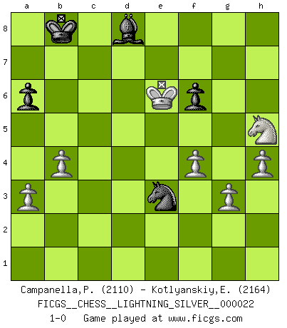 Last move : 1-0 2010 August 7 4:15:52 [Event "FICGS__CHESS__LIGHTNING_SILVER__000022"] [Site "FICGS"] [Date "2010.08.07"] [Round "1"] [White "Campanella,Paul"] [Black "Kotlyanskiy,Edward"] [Result "1-0"] [WhiteElo "2110"] [BlackElo "2164"] 1.e4 c6 2.d4 d5 3.e5 c5 4.Nf3 Bg4 5.c4 cxd4 6.Qa4+ Qd7 7.Qxd7+ Nxd7 8.Nxd4 dxc4 9.h3 Bh5 10.f4 O-O-O 11.Nc3 e6 12.Bxc4 Nb6 13.Be2 Bxe2 14.Ncxe2 Kb8 15.Kf2 Ne7 16.b3 Ned5 17.Bb2 Rg8 18.Rhd1 Bc5 19.Rac1 Nd7 20.h4 Be7 21.g3 a6 22.Nc3 Nc5 23.Kf3 h5 24.Rd2 Rge8 25.Rcd1 Nxc3 26.Bxc3 Rd5 27.Ke3 Red8 28.Ba5 R8d7 29.a3 f6 30.exf6 gxf6 31.b4 Na4 32.Nxe6 Nc3 33.Rxd5 Nxd5+ 34.Kf3 b6 35.Bxb6 Nxb6 36.Rxd7 Nxd7 37.Ke4 Nb6 38.Ng7 Nc4 39.Nxh5 Bd8 40.Kf5 Ne3+ 41.Ke6 1-0 Caro-Kann : Advance variation Queenside Castling by player Black (move 10) Player White won this chess game. Follow this game move after move (download)Fischer, who may or may not be mad as a hatter, has every right to be horrified. (Jeremy Silman) Ich spiele ehrlich und spiele, um zu gewinnen. Wenn ich verliere nehme ich meine Medizin. (Robert James Fischer) Con o sin el título, Bobby Fischer fue sin lugar a dudas el mas grande jugador de su época. (Burt Hochberg) La menace est plus forte que l'exécution. (Aaron Nimzovitch) The question of whether computers can think is just like question of whether submarines can swim. (Edsger W. Dijkstra)