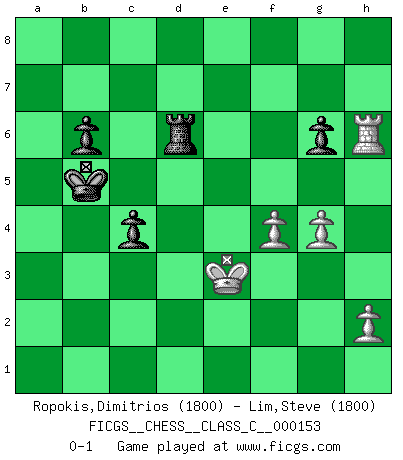 Last move : 0-1 2010 September 4 10:39:23 [Event "FICGS__CHESS__CLASS_C__000153"] [Site "FICGS"] [Date "2010.08.07"] [Round "1"] [White "Ropokis,Dimitrios"] [Black "Lim,Steve"] [Result "0-1"] [WhiteElo "1800"] [BlackElo "1800"] 1.e4 e6 2.c4 d5 3.exd5 exd5 4.d4 Nf6 5.Nf3 Bb4+ 6.Bd2 Nc6 7.a3 Bxd2+ 8.Nbxd2 O-O 9.Be2 Bg4 10.O-O dxc4 11.Nxc4 Re8 12.Re1 Rb8 13.Qd3 Bxf3 14.Bxf3 Rxe1+ 15.Rxe1 Nxd4 16.b4 Nxf3+ 17.Qxf3 Qd5 18.Qxd5 Nxd5 19.g3 Kf8 20.Kg2 c6 21.Na5 Nc3 22.Rc1 Nb5 23.a4 Nd6 24.Nc4 Nxc4 25.Rxc4 Rd8 26.b5 Rc8 27.Kf3 c5 28.Ke4 b6 29.a5 Rd8 30.Ra4 Ke7 31.axb6 axb6 32.Ra6 Rd4+ 33.Ke3 Rd6 34.Ra7+ Ke6 35.g4 h6 36.f4 g6 37.Rc7 Kd5 38.Rxf7 Kc4 39.Rh7 Kxb5 40.Rxh6 c4 0-1 French defense, Steiner variation Kingside Castling by player Black (move 8) Kingside Castling by player White (move 10) 10 pieces endgame at move 40 : White KRPPP , Black KRPPP WHITE : King + 1 Rook 3 Pawns BLACK : King + 1 Rook 3 Pawns Player Black won this chess game. Follow this game move after move (download)Not all artists are Chess players, but all Chess players are artists. (Marcel Duchamp) Ich möchte Schüler heranbilden, die das Vermögen haben, selbst zu denken und Kritik zu üben. (Emanuel Lasker) Un entendimiento minucioso de las típicas continuaciones de mate hacen de las mas complicadas combinaciones de sacrificio que conducen hacia ellas no solo no dificiles, sino casi un asunto de rutina. (Siegbert Tarrasch) On est toujours la mazette de quelqu'un d'autre. (Anonyme) Patience, use the Force, think ! (Obi-Wan Kenobi in Star Wars ep.2)